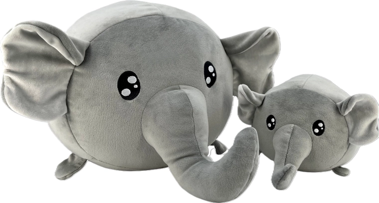 Kleinere olifant (20 cm) voor baby’s en de grotere (40 cm) als kussentje voor onderweg, in de auto of om thuis te relaxen.