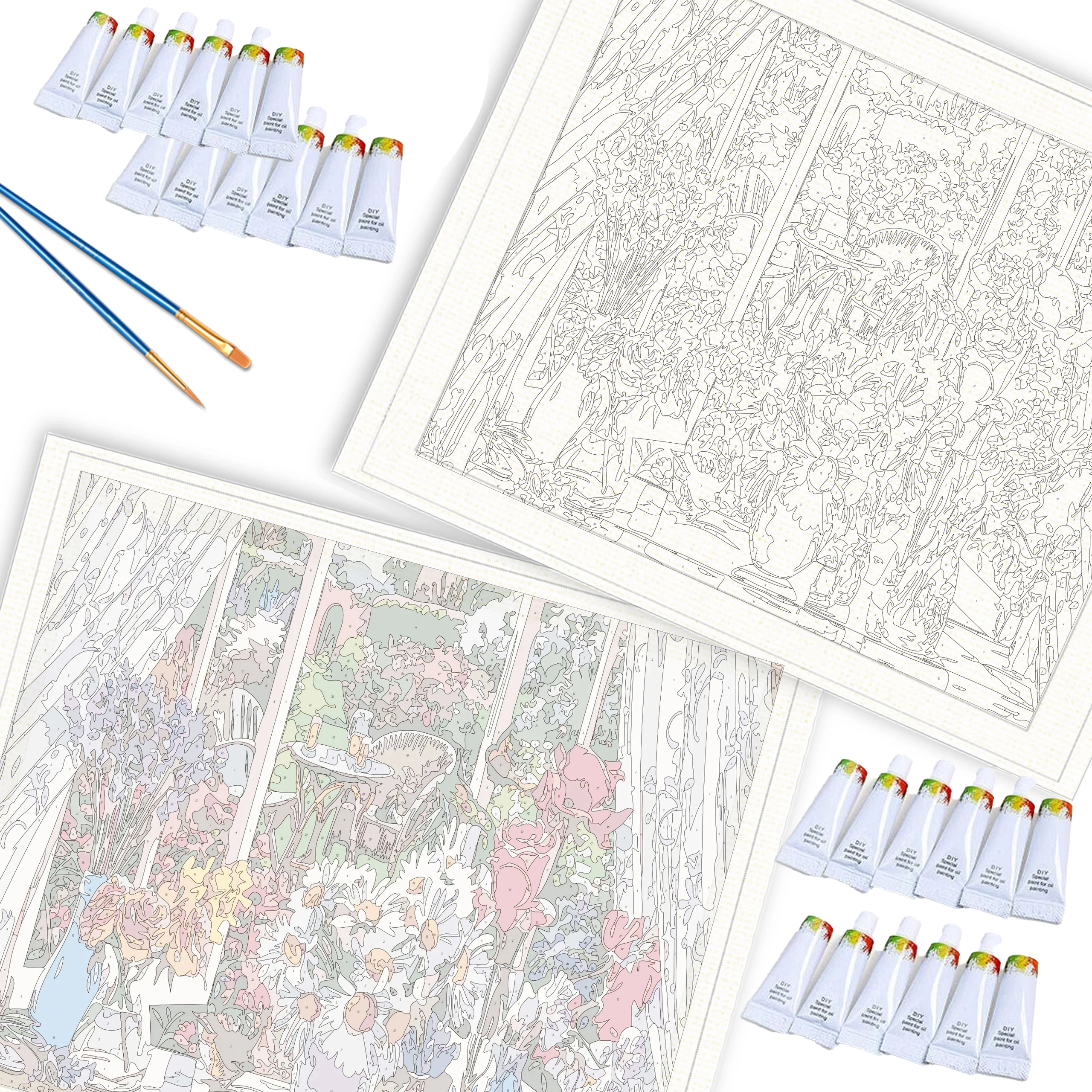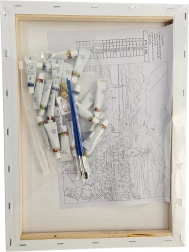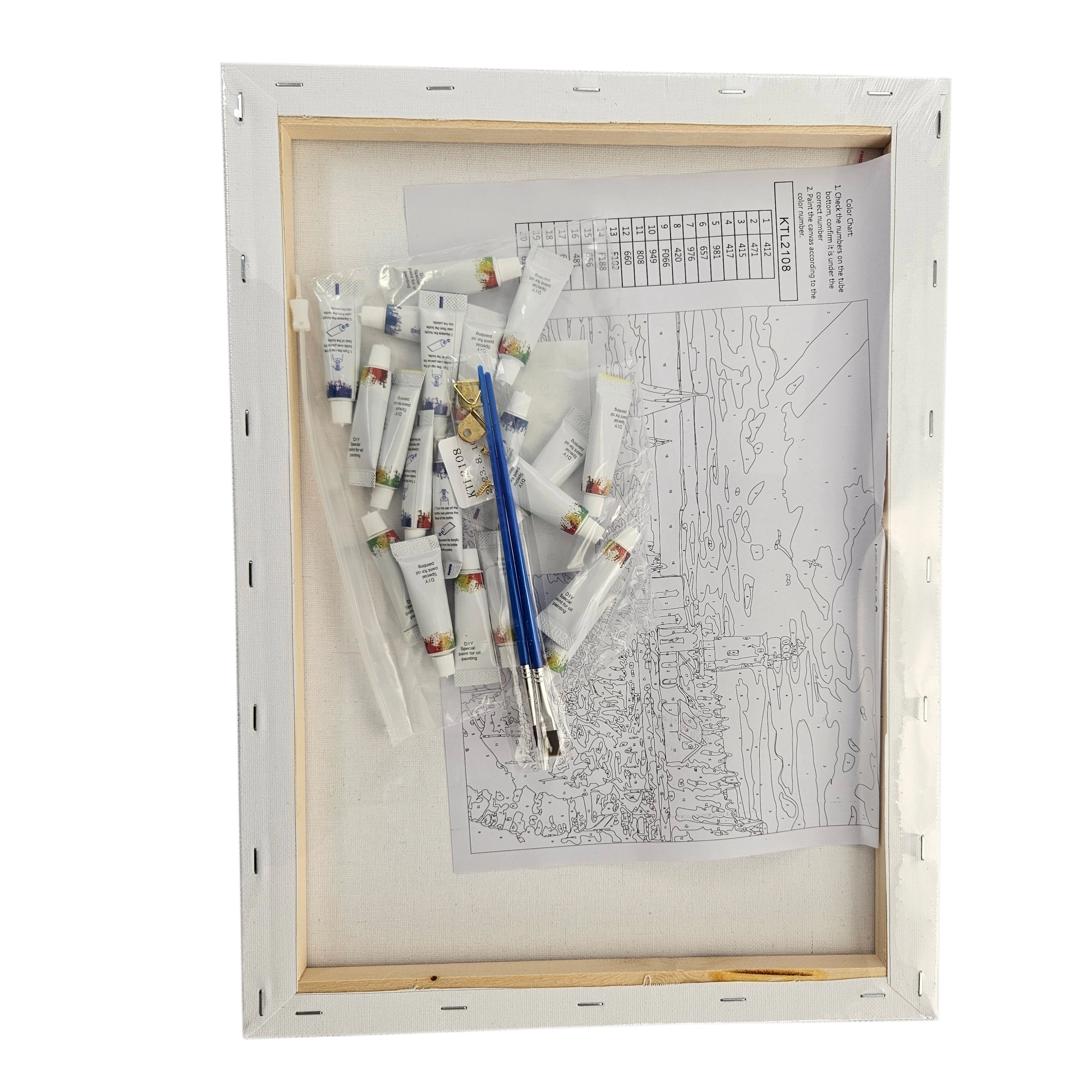 Het doek is opgespannen op een houten frame (spieraam), zodat je meteen na het uitpakken kunt beginnen met schilderen en het voltooide schilderij direct kunt ophangen. In de verpakking vind je een complete set – een voorbedrukt doek, meerdere tinten acrylverf, penselen en accessoires voor eenvoudig ophangen aan de muur.
