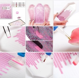 In de doos vind je een zelfklevend canvas met symbolen, zakjes met gekleurde “diamanten”, een applicatiepen met was en een geribbeld schaaltje voor comfortabel oppakken. Je hoeft alleen een steentje op te pakken, op het bijbehorende symbool te plaatsen en het beeld komt stap voor stap tot leven.