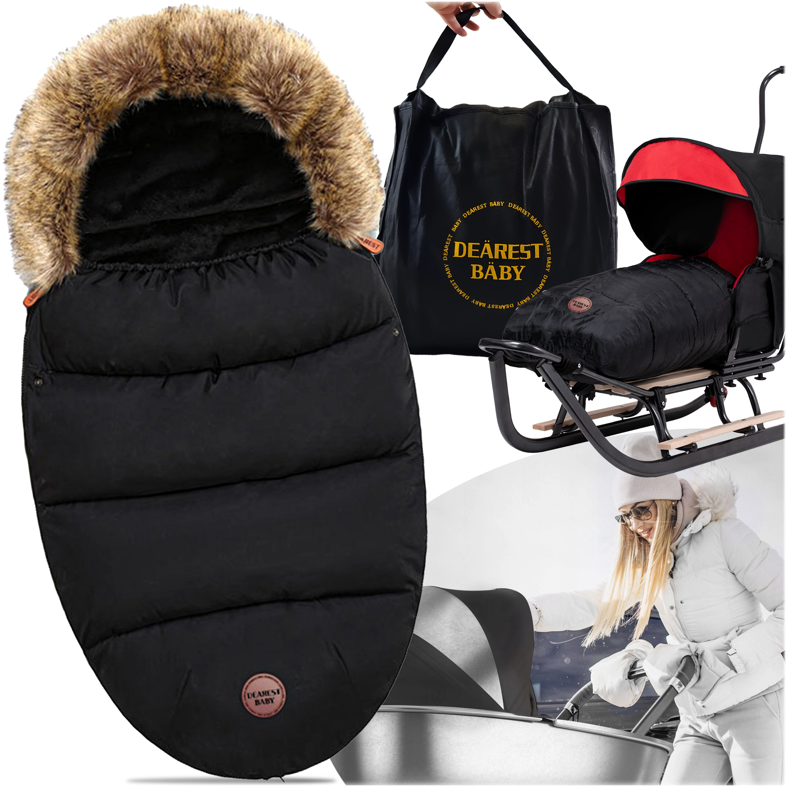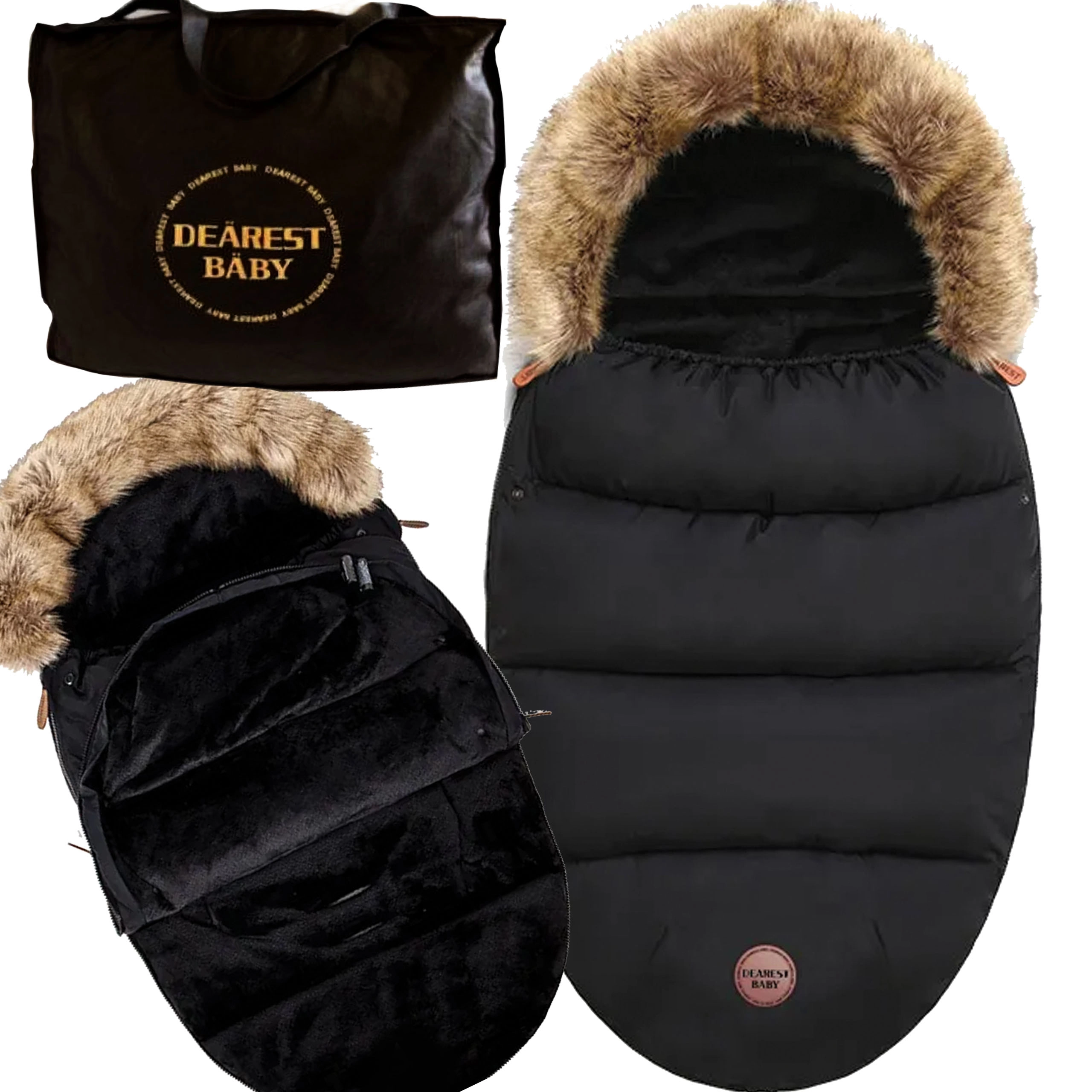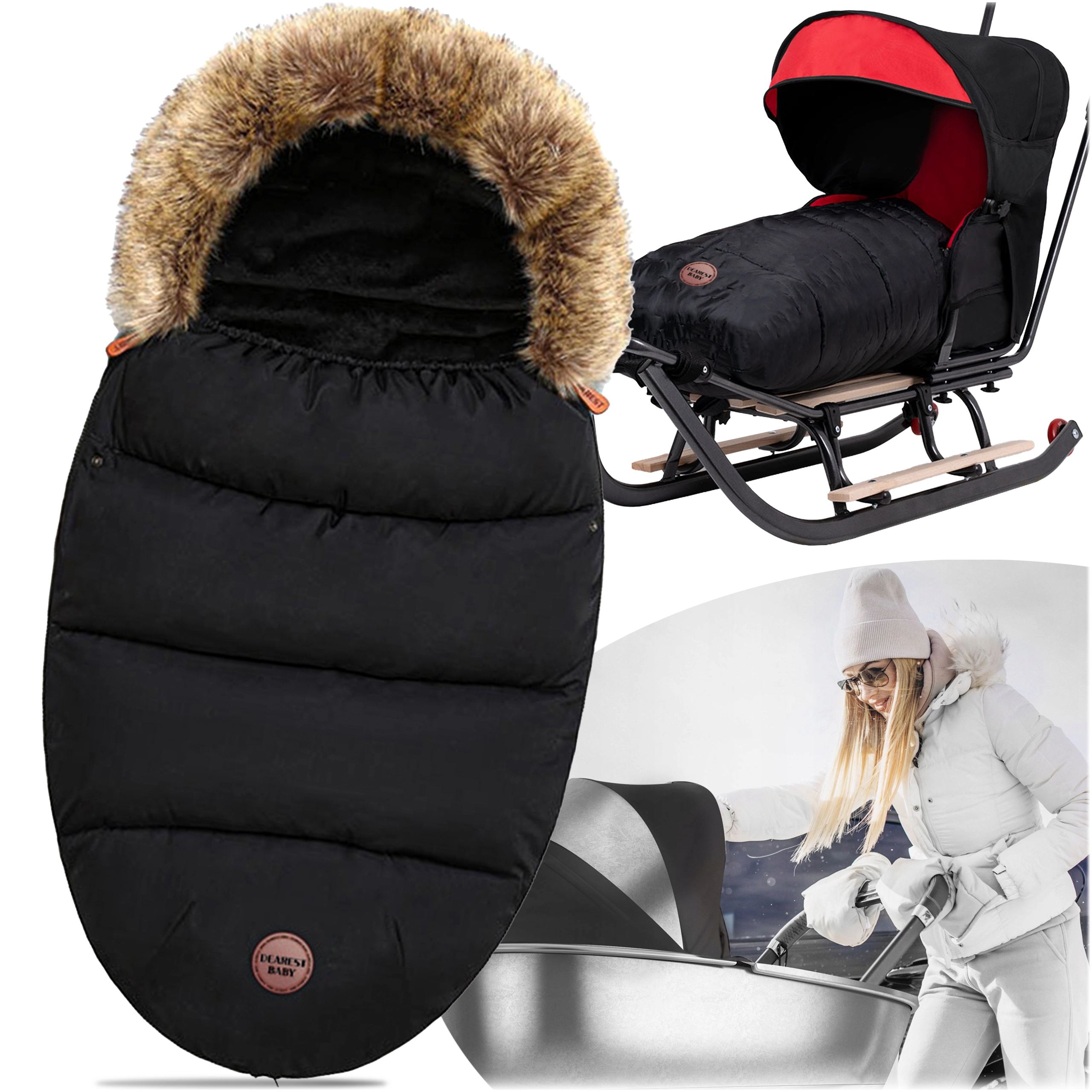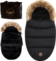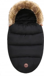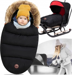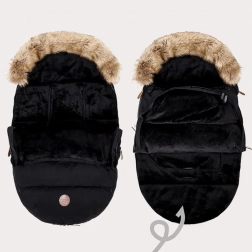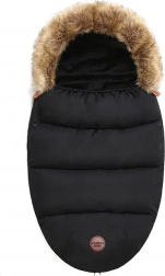 Wintervoetenzak voor kinderwagen en slee met bontkap – zwart