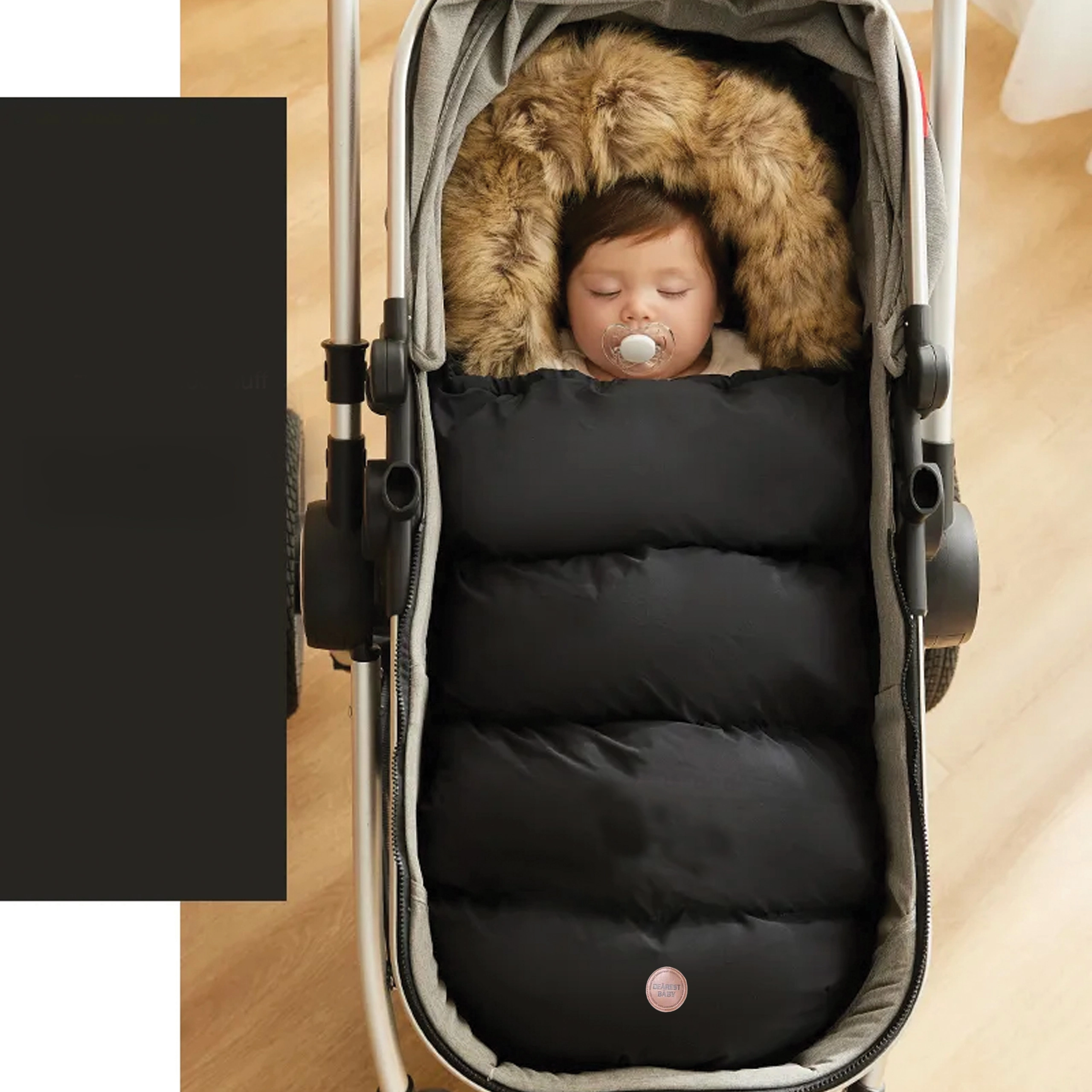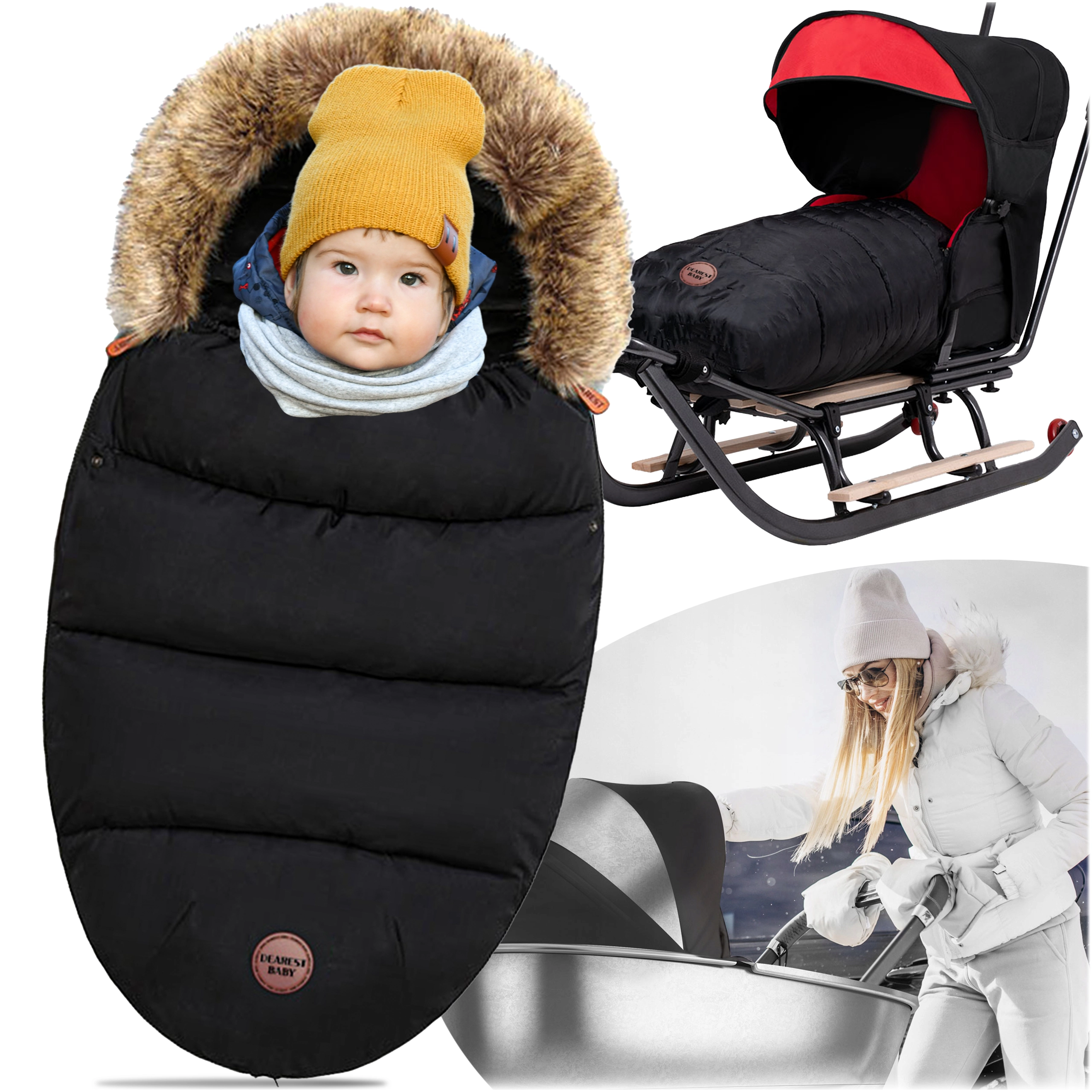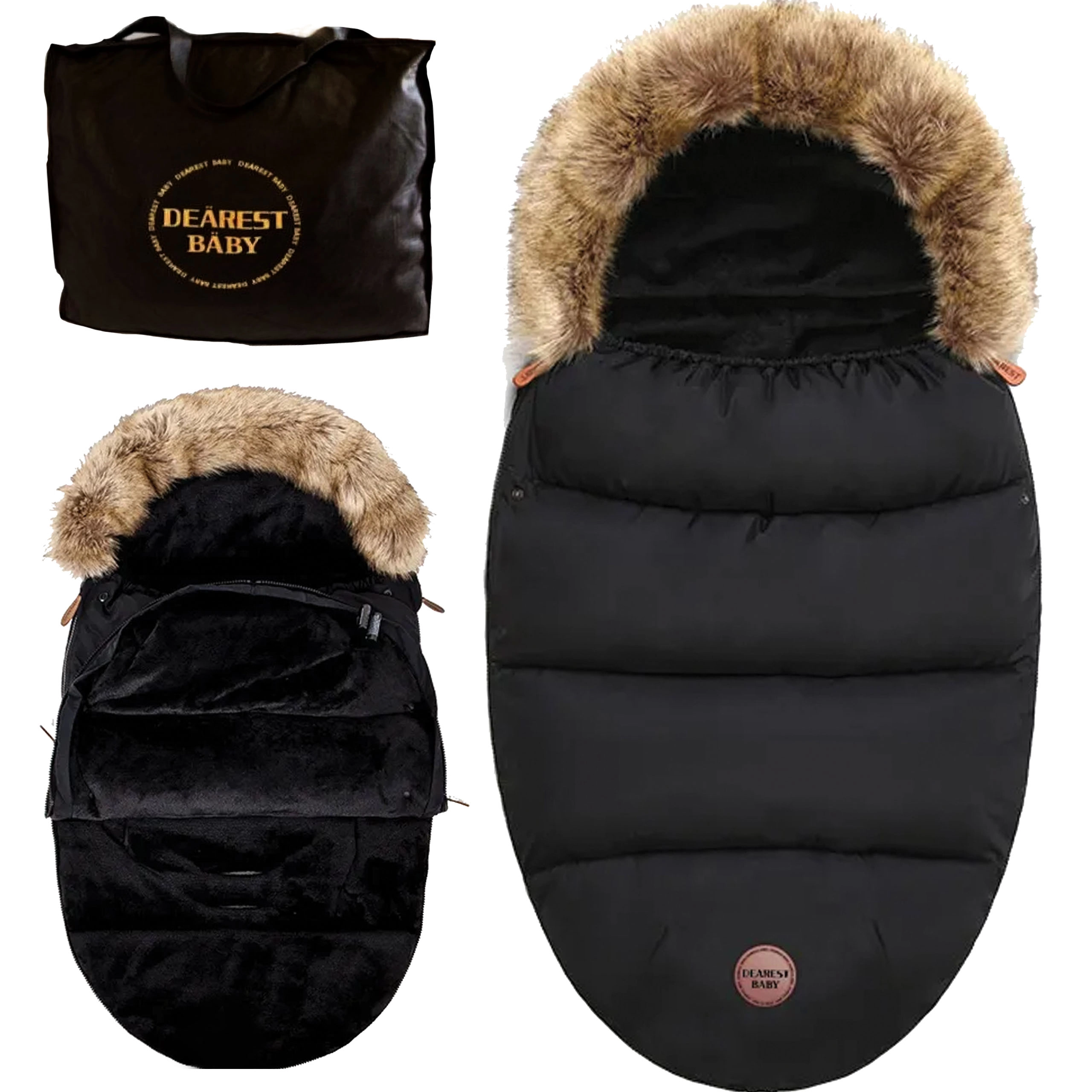 Wintervoetenzak voor kinderwagen en slee met bontkap – zwart