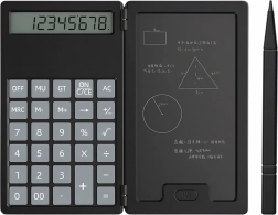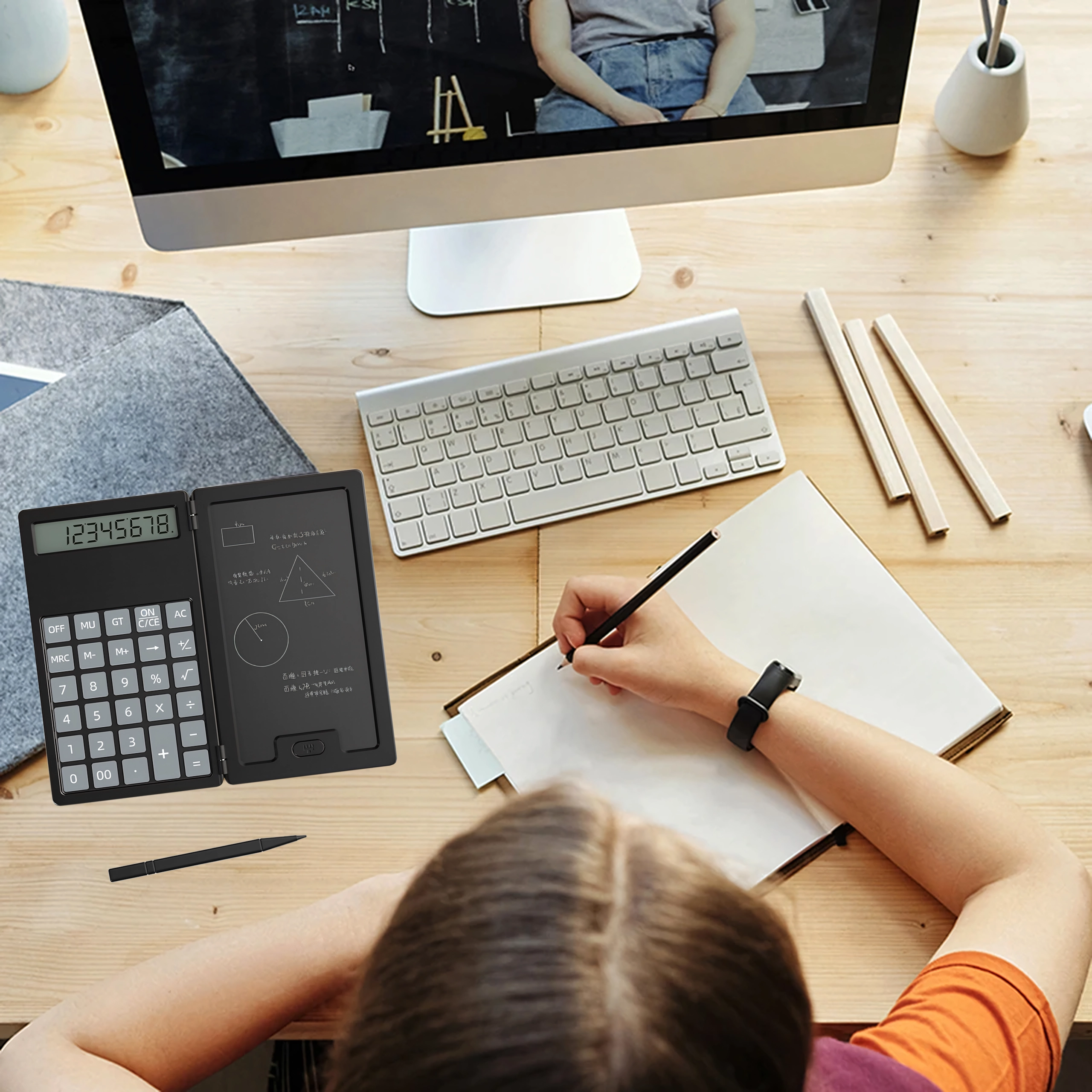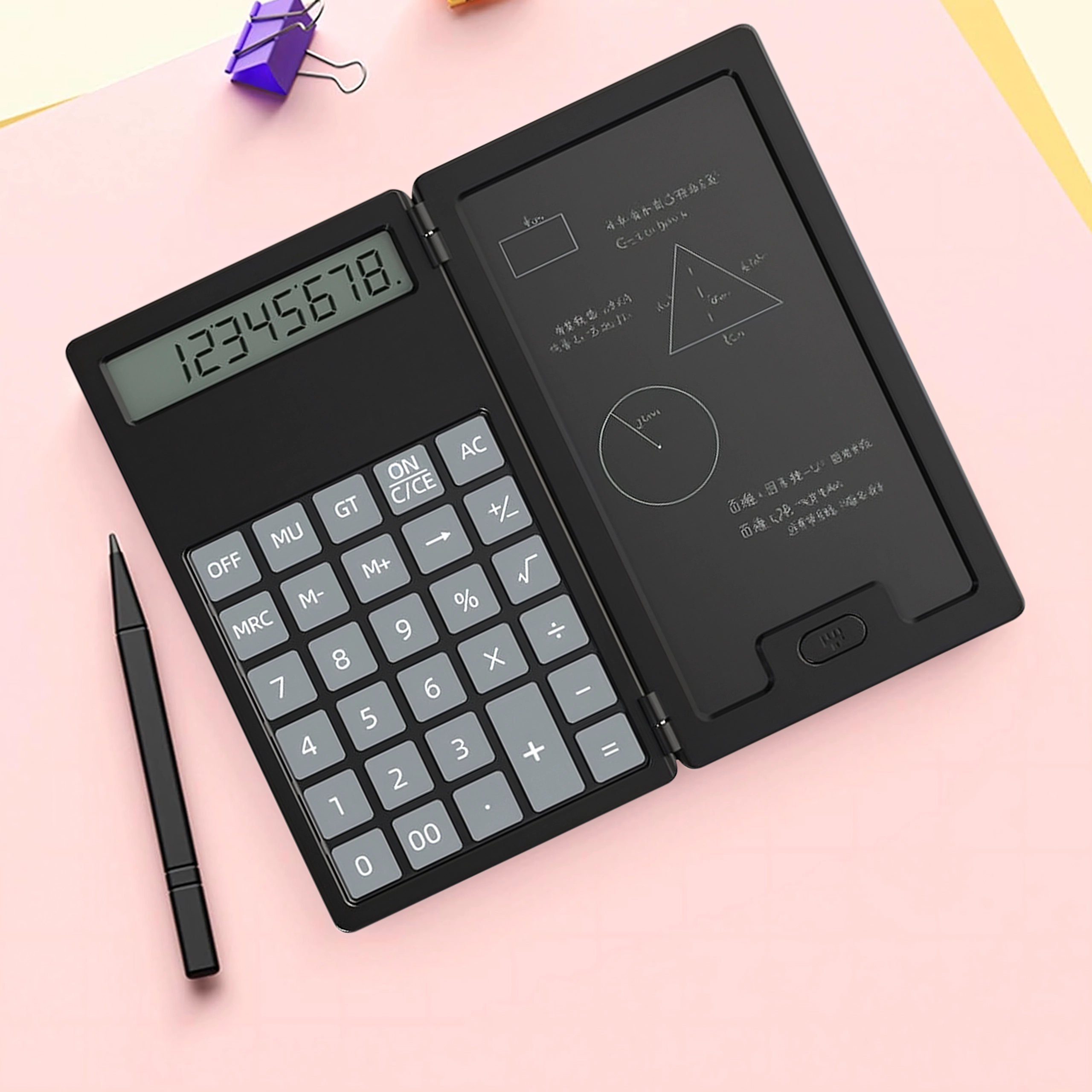 Links een nauwkeurige rekenmachine, rechts een LCD-schrijfvlak voor snelle notities – ideaal voor berekeningen, formules en schetsen zonder papier.