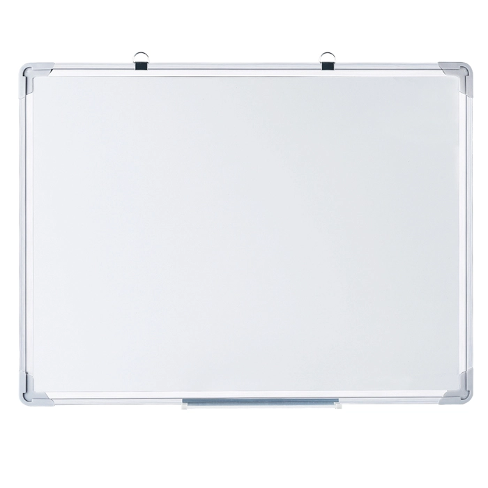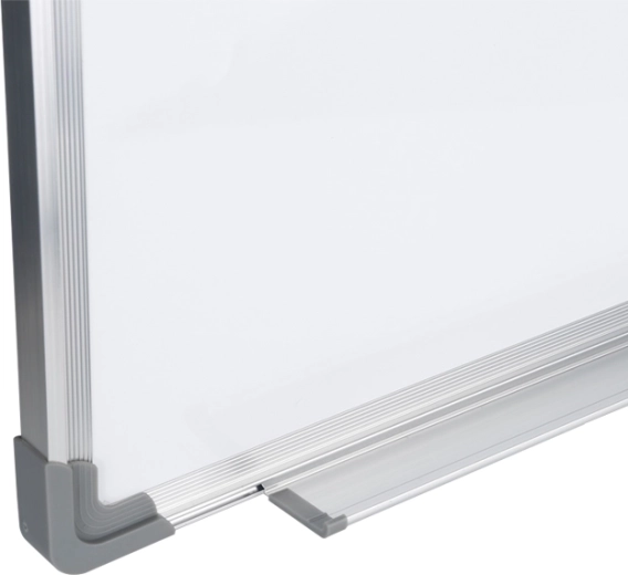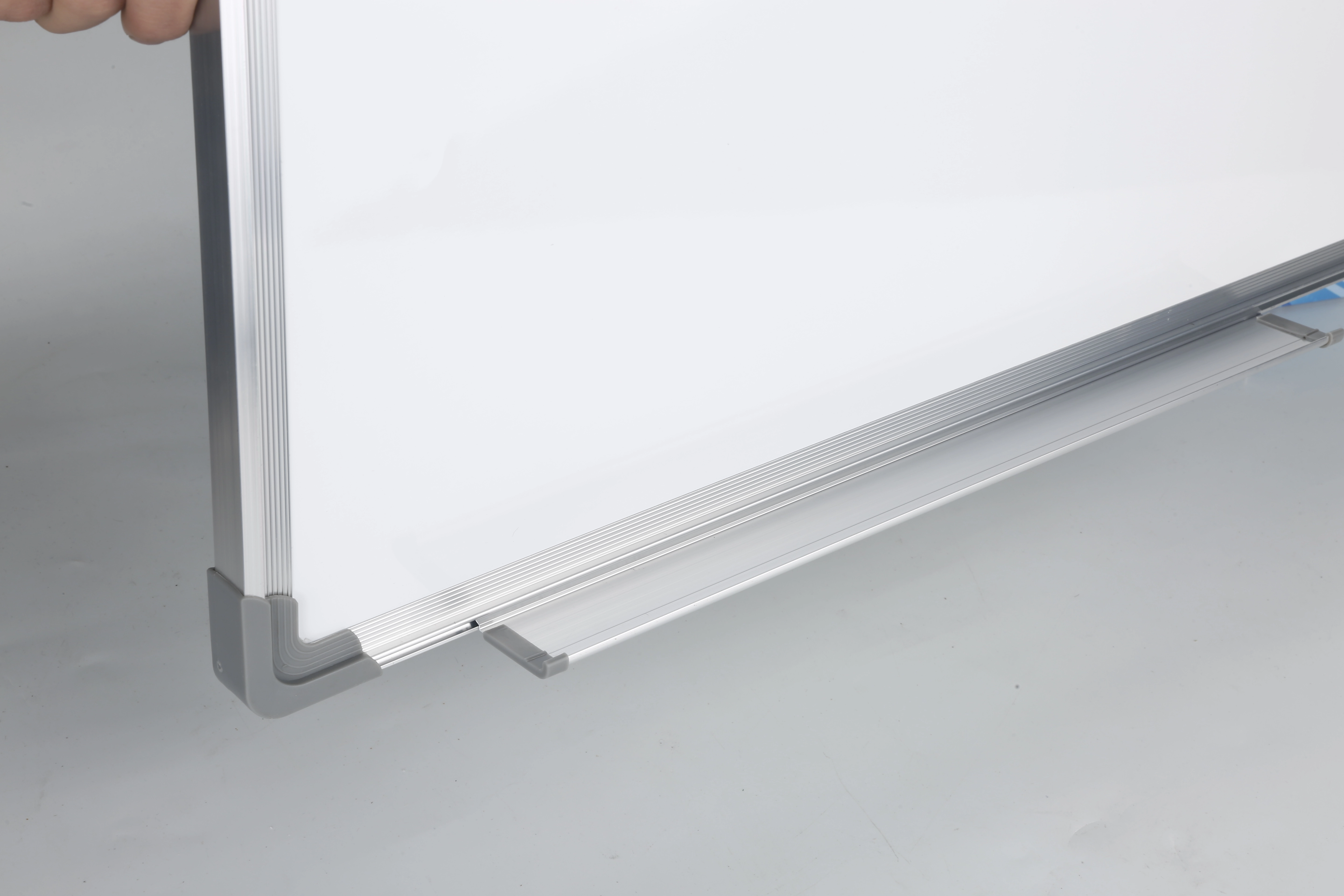 Licht aluminium frame met hoekbeschermers en pennenlegger. Montagebeugels maken snel ophangen aan de muur mogelijk.
