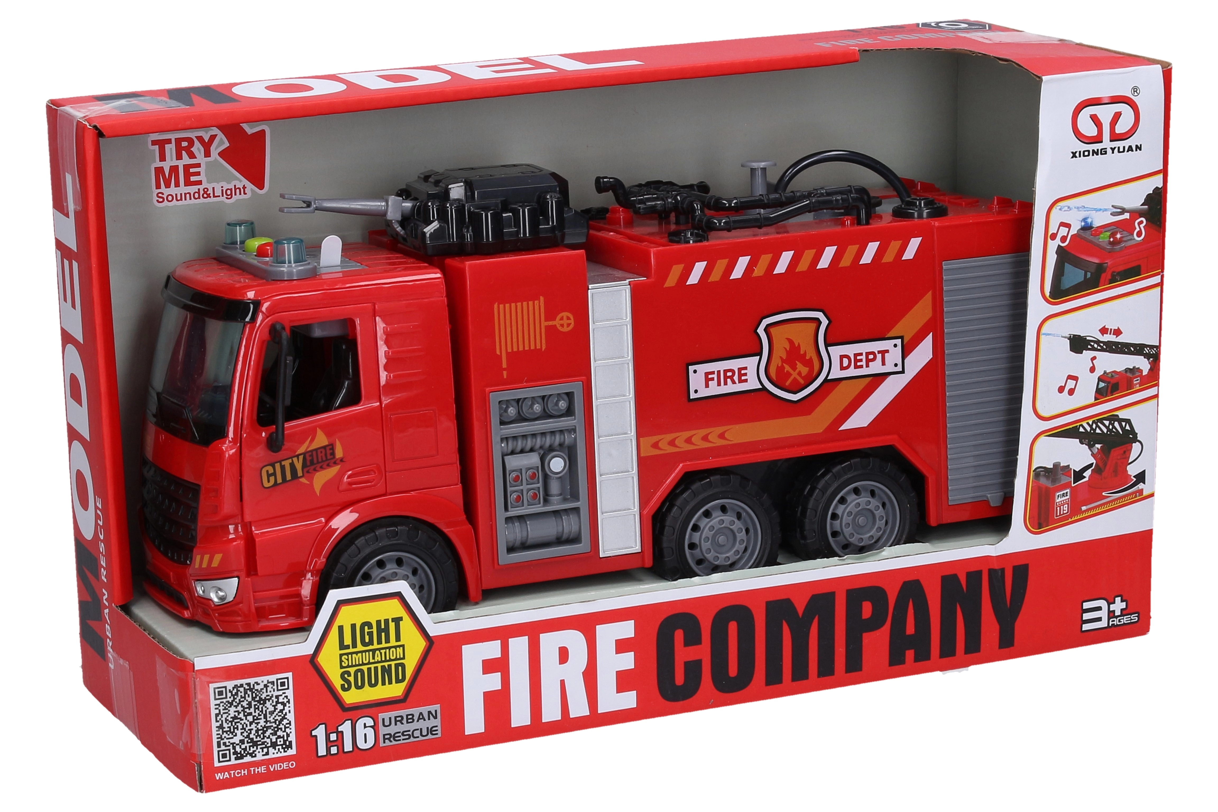Deze gedetailleerde brandweerauto biedt kinderen volop actie: vul het reservoir in de tank en spuit echt water door op de knop op de tank te drukken. De knoppen op de cabine activeren licht- en geluidseffecten, die de spelbeleving versterken en de fantasie van kleine reddingswerkers stimuleren.