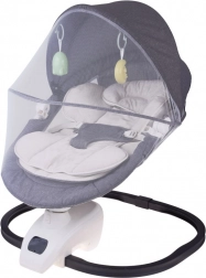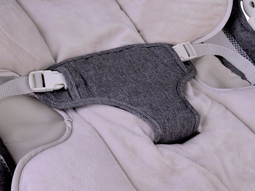 Het geïntegreerde paneel met muziek en de afstandsbediening laten je de schommelintensiteit, het volume instellen, slaapliedjes kiezen en de timer gebruiken (bijv. 8/15/30 min). De verstelbare kap met speeltjes schermt tegen licht, het fijne muggennet beschermt tegen insecten. De bekleding is eenvoudig afneembaar en wasbaar, de constructie is stabiel en veilig.
