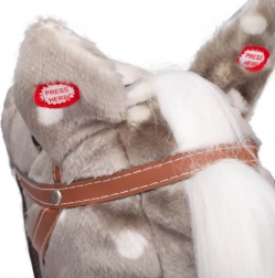 Bij het indrukken van het oor beweegt het paardje zijn mondje en speelt het het liedje Prší, prší in het Tsjechisch of Slowaaks. Geweldig voor plezier en ontwikkeling van het gehoor.