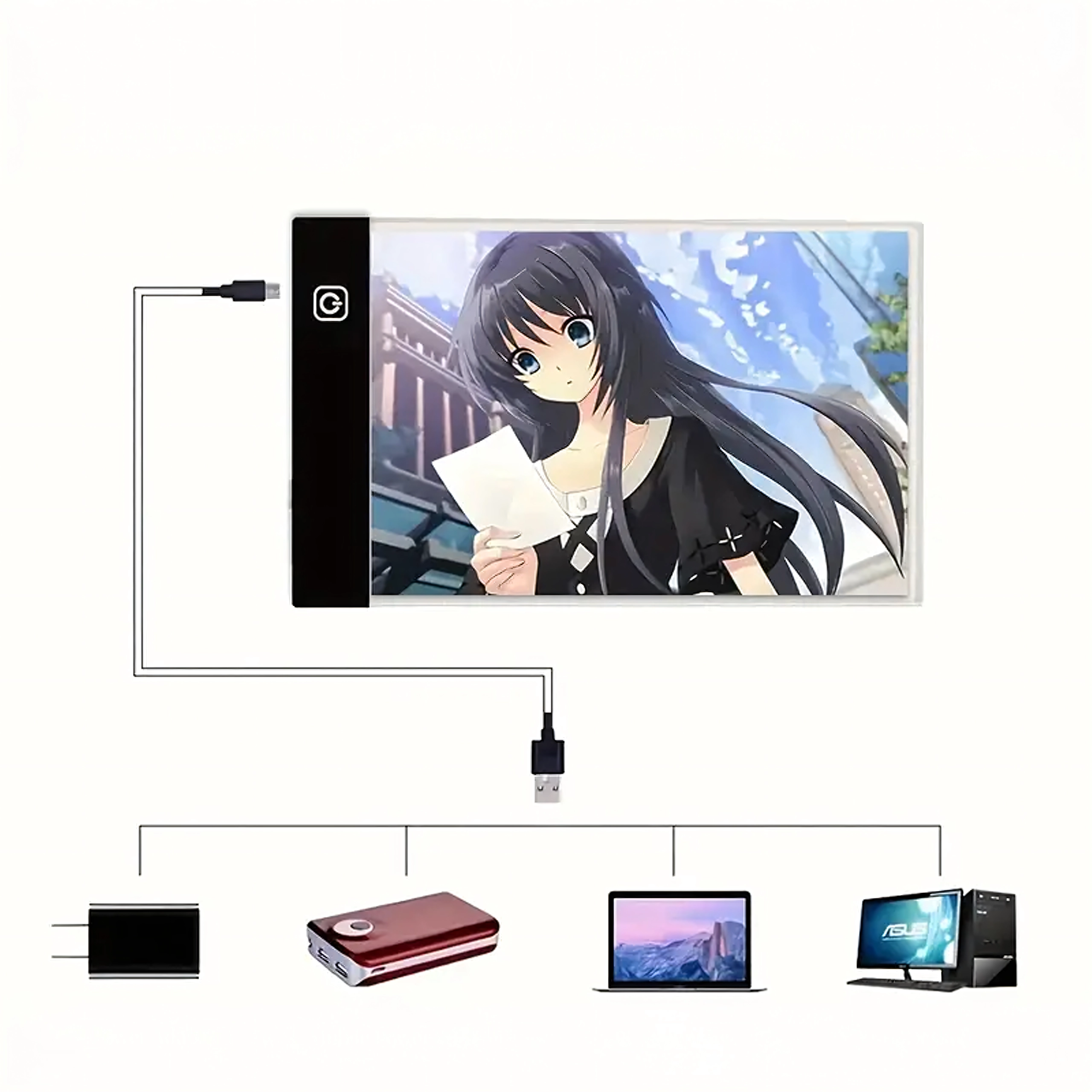 Sluit de lichtpad aan op een laptop, powerbank of adapter. De touchknop zorgt voor direct inschakelen en comfortabel gebruik.