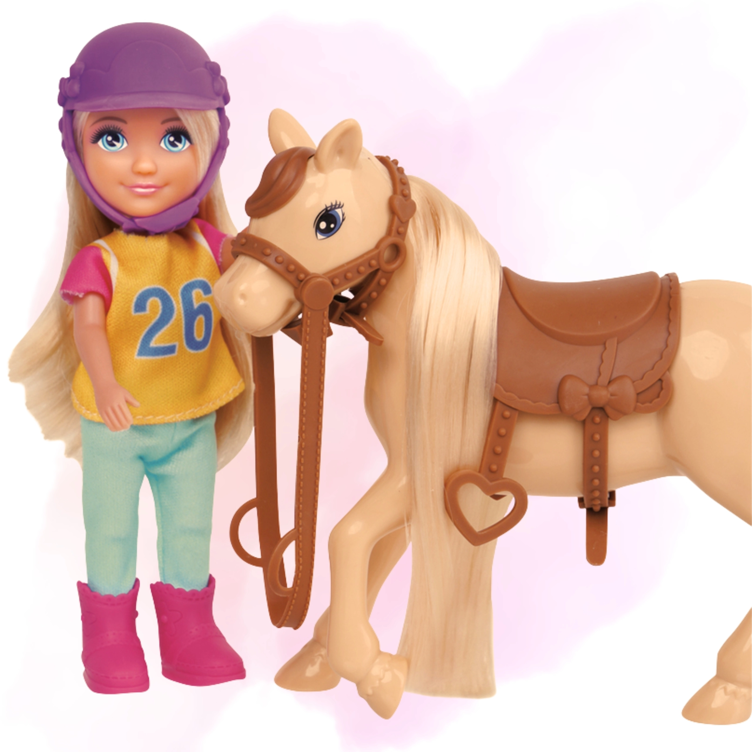 - Stijlvolle look – paarse helm, roze en gele details, lichtbruine pony