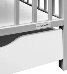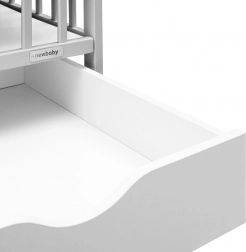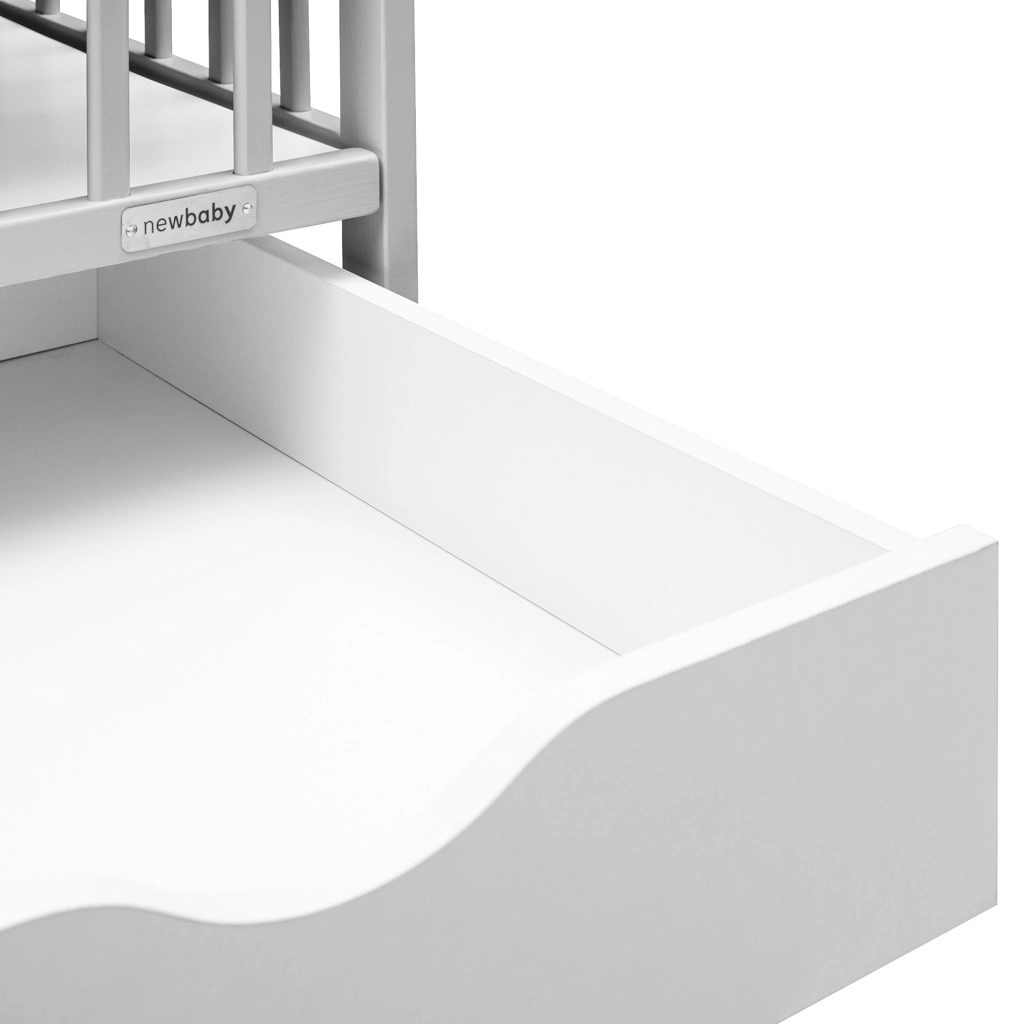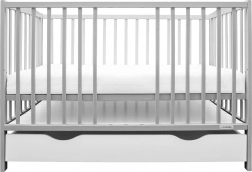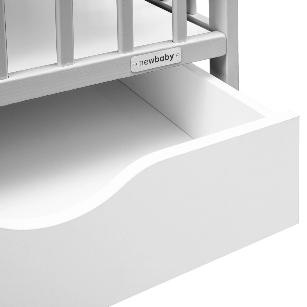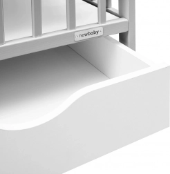 De praktische MDF-lade op kogelgeleiders raakt de vloer niet, schuift daardoor gemakkelijk en blijft schoon. De verstelbare lattenbodem in drie hoogtes (22 / 38 / 51 cm vanaf de vloer) past zich aan zowel pasgeborenen als peuters aan, en drie uitneembare spijlen maken veilig zelfstandig in- en uitstappen mogelijk zonder de hele zijkant te laten zakken.