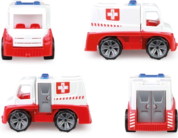 Robuuste kunststof ambulance LENA TRUXX voor kleine hulpverleners met mechanische functionaliteit, te openen deuren en een openklapbare cabine. Inclusief hulpverlener-figuurtje en brancard voor realistisch spel. Lengte 29 cm, geschikt vanaf 2 jaar, ideaal voor in het zand en thuis, zonder batterijen.
