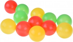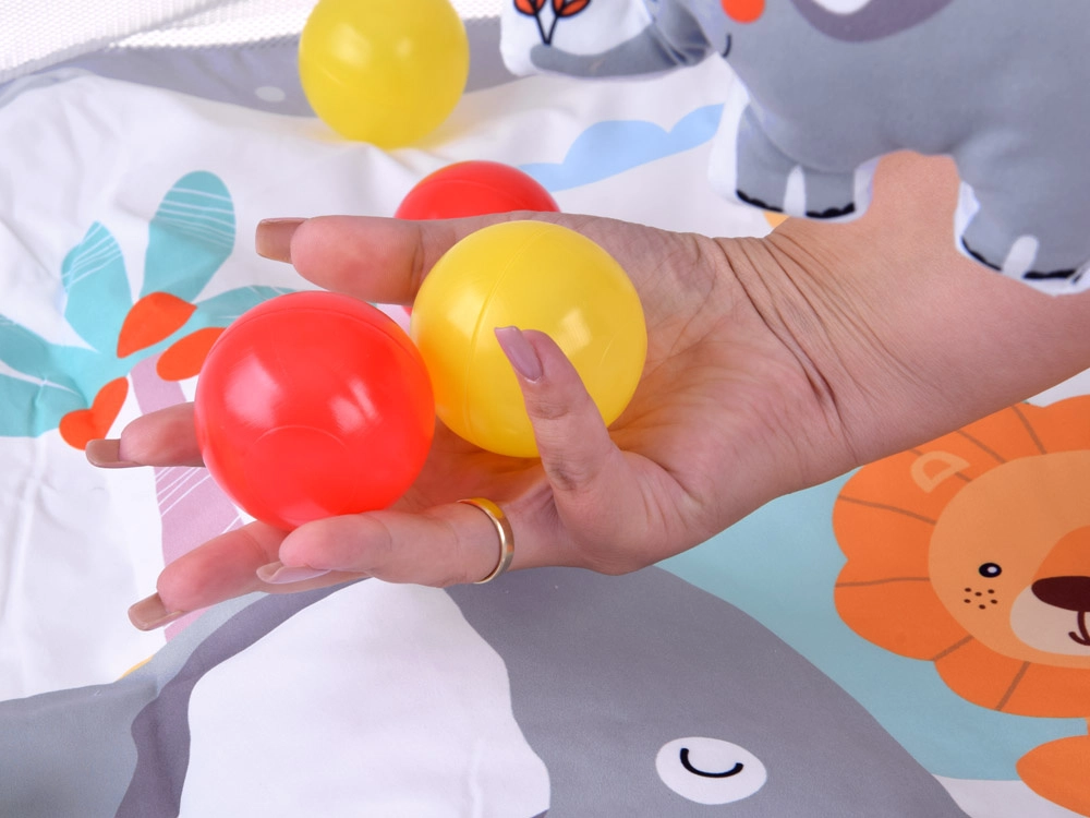 Pluchen diertjes, een zonnetje met wolkje, een babypiegeltje en gekleurde ballen stimuleren zicht, tast en gehoor en moedigen reiken, grijpen en omrollen aan.