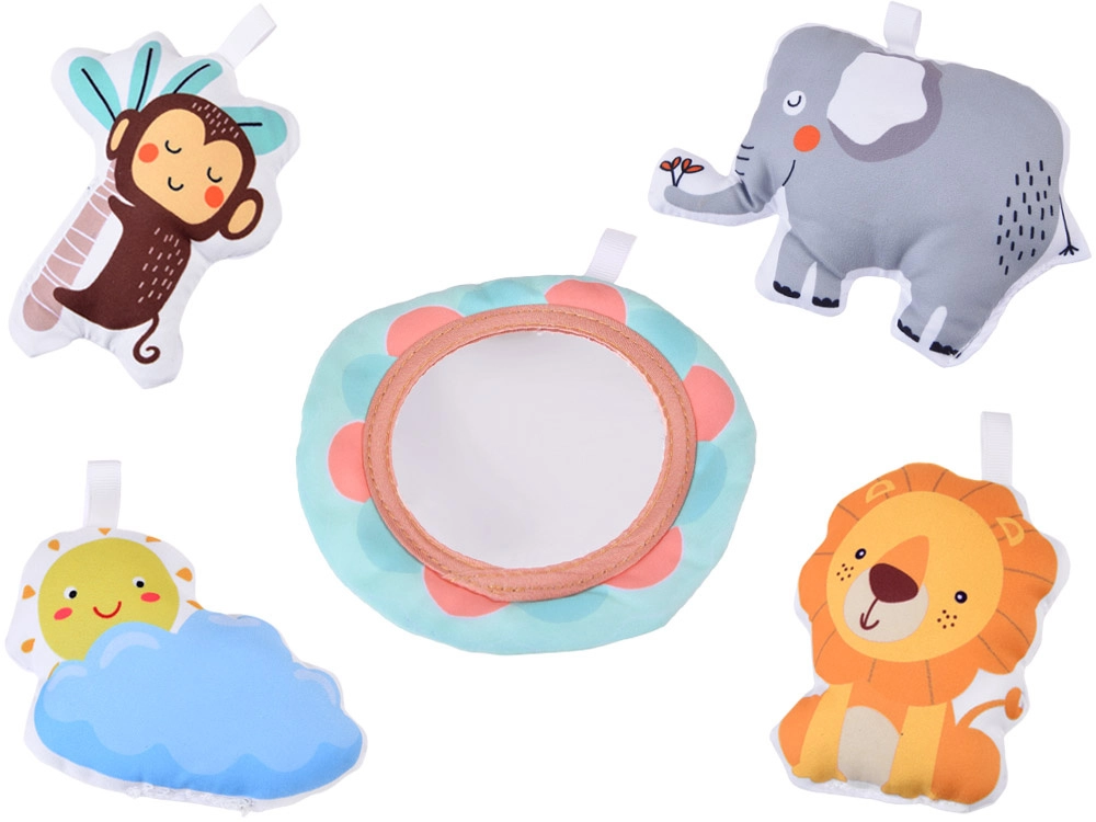 - hangspeeltjes inclusief spiegeltje, zonnetje met wolkje en diertjes (leeuw, olifant, aapje)