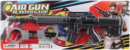 Leuke kunststof set voor kleine actiehelden met een machinegeweer van 40 cm, 2 zuignapkogels en kinderhandboeien. Ideaal voor veilige en creatieve rollenspellen als politie of speciale eenheden. Verpakt op kaart, aanbevolen vanaf 3 jaar.