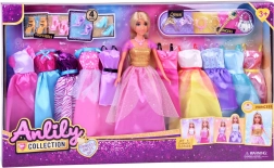 Deze betoverende set voor jonge modeliefhebbers biedt alles wat nodig is voor creatief verkleden. De ANLILY-pop met lang haar en gedetailleerde make-up kan worden aangekleed met 11 verschillende jurken – glinsterend, met tule, met patronen en effen, kort en lang. De uitgebreide set accessoires (kroontjes, kettingen, handtas, scepter en pumps in verschillende kleuren) geeft elke styling een uniek accent.