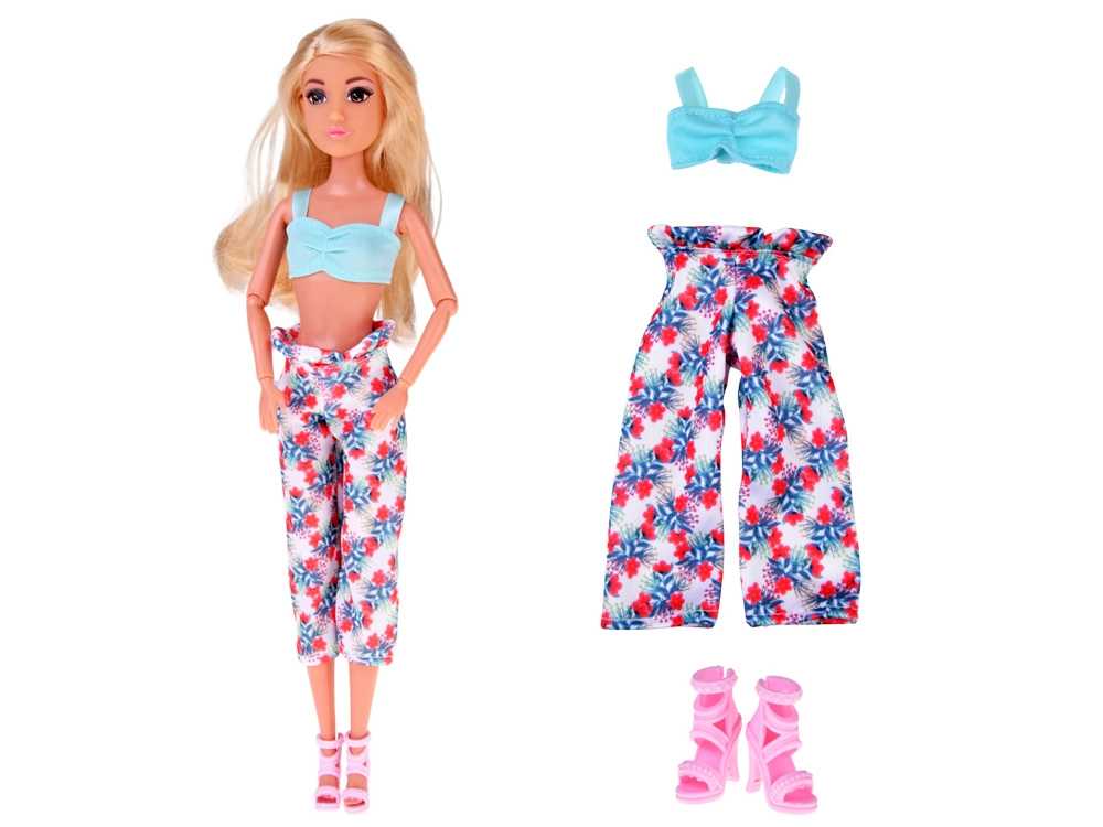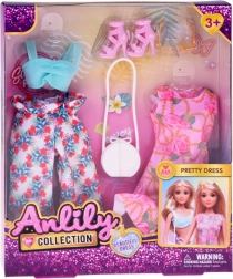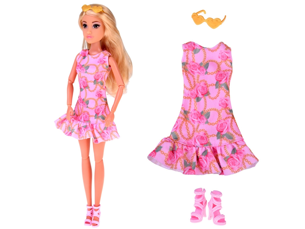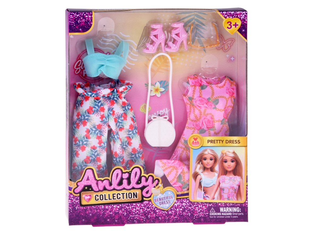 De set bevat een romantische roze jurk met bloemen- en kettingpatroon en een comfortabele turquoise top met bloemige wijde broek. De stijl wordt afgemaakt met roze pumps, gele hartvormige bril, een kleine handtas en andere kleine accessoires. Perfect voor mixen en matchen van outfits en spelen als mode-stylist.