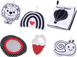 Zachte figuurtjes, een contrasterend boekje, een rammelaar, spiegeltje en bijtspeeltje stimuleren grijpen, oog‑handcoördinatie en zintuiglijke waarneming.