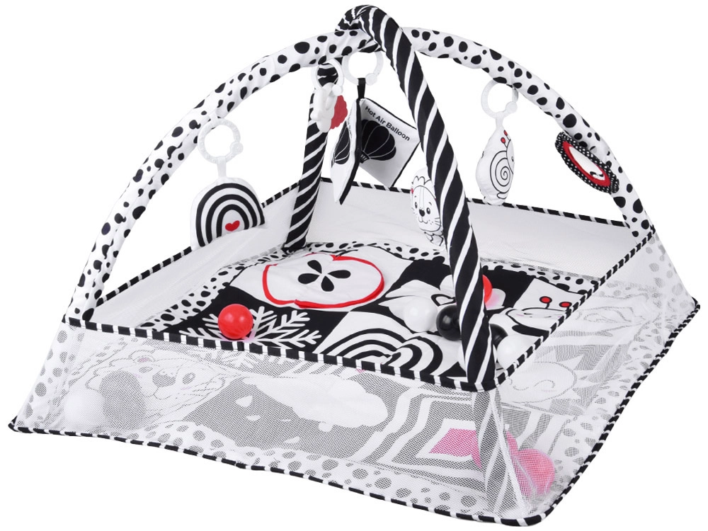 Twee zacht gewatteerde bogen met verschillende hangspeeltjes motiveren tot reiken, grijpen en bewegen. De netzijden veranderen de mat in een handomdraai in een knusse speelrand met ballen voor veilig spelen onder toezicht van volwassenen.