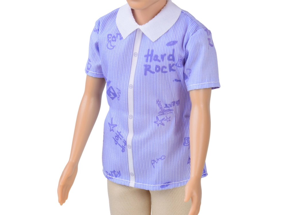 Een elegant overhemd met kraag, lichte broek en witte schoenen geven de pop een moderne look. De kleding kan worden uitgetrokken en gecombineerd.