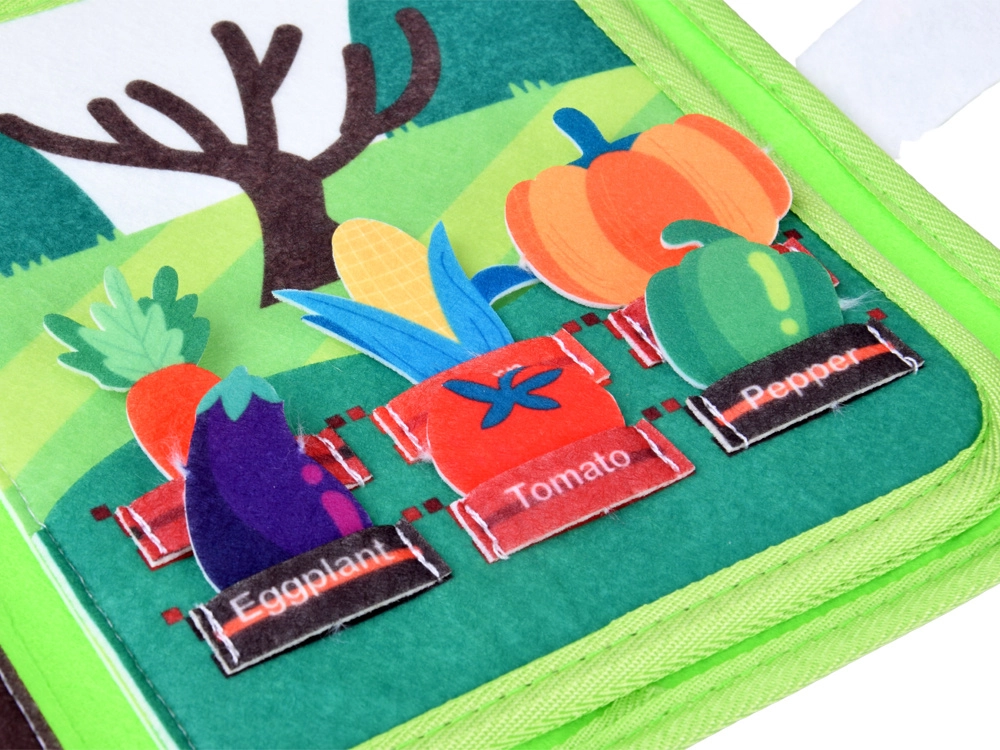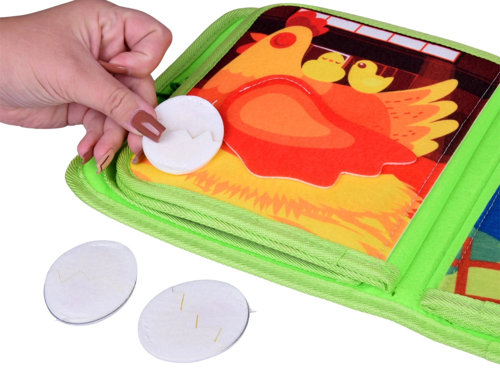 Het boekje is gemaakt van zacht vilt dat prettig aanvoelt; alle randen zijn glad en veilig voor kleine handjes. Het stimuleert fijne motoriek, zintuiglijke prikkeling, woordenschat en zelfstandig spel. Dankzij het compacte formaat is het een ideale metgezel thuis en onderweg.