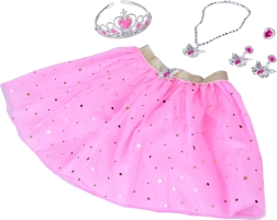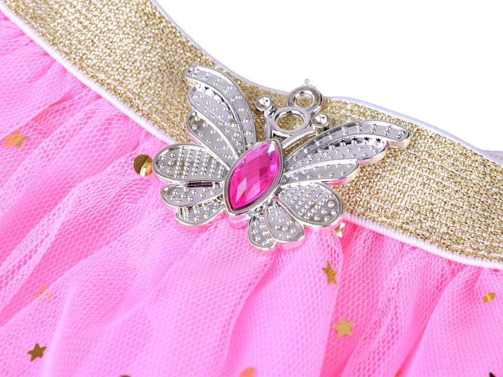 Creëer thuis een betoverende wereld vol schittering en fantasie. De roze tule rok met sterretjes en maantjes zwiert elegant bij elke stap, terwijl de lichte kunststof kroon en bijpassende accessoires kleine prinsessen zelfvertrouwen en een stralende glimlach geven. De set is afgestemd op het vlinder-motief – het symbool van lichtheid en vrijheid.