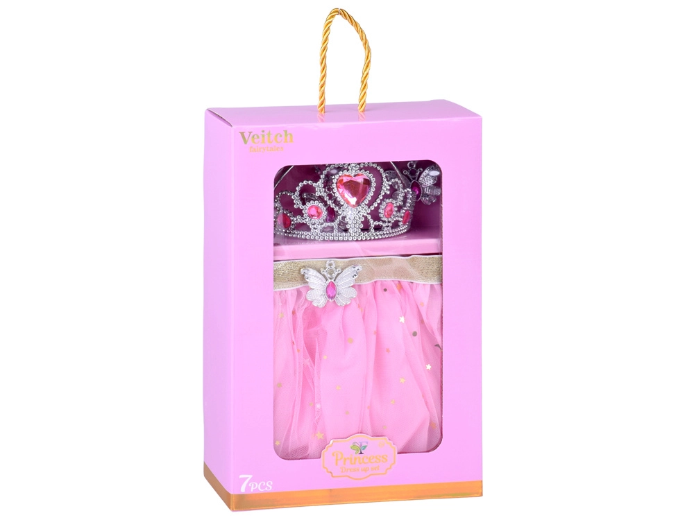 Prikkel de fantasie van je kind met deze betoverende verkleedset: een roze glinsterende rok met een gouden elastische tailleband, een zilverkleurige kroon met roze steentjes, een vlinderhangerketting, een ring en vlinderoorbellen. Ideaal voor sprookjesspelletjes, verjaardagsfeestjes en carnaval.