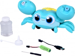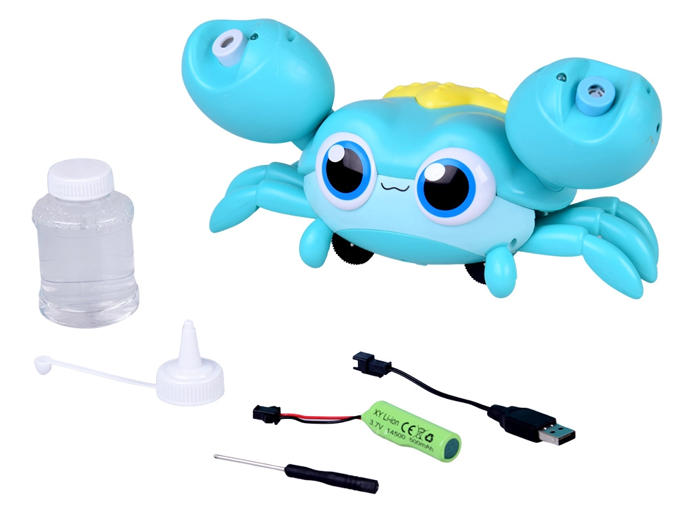 Inbegrepen zijn een oplaadbare 3,7 V Li‑ion accu, USB‑kabel en een fles met bellenvloeistof – vul bij, zet aan en kijk hoe de krab een glimlach op kindergezichten tovert.