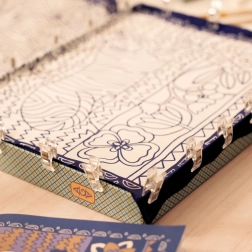 In de doos vind je een zijden sjaal met motief, een set textielverf, penselen, klemmen en praktische organizers. Gewoon uitpakken en beginnen met creëren.