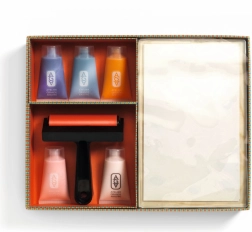 Alles wat je nodig hebt voor je eerste print: gelplaat, brayer, verf, papier en sjablonen. Open de doos en ga aan de slag – zonder extra hulpmiddelen.