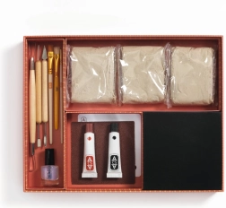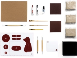 - Boetseerklei (meerdere zakjes), modelleertools, penselen, verf/lijm, lak/eindafwerking, sjablonen en werkmat, opbergbox