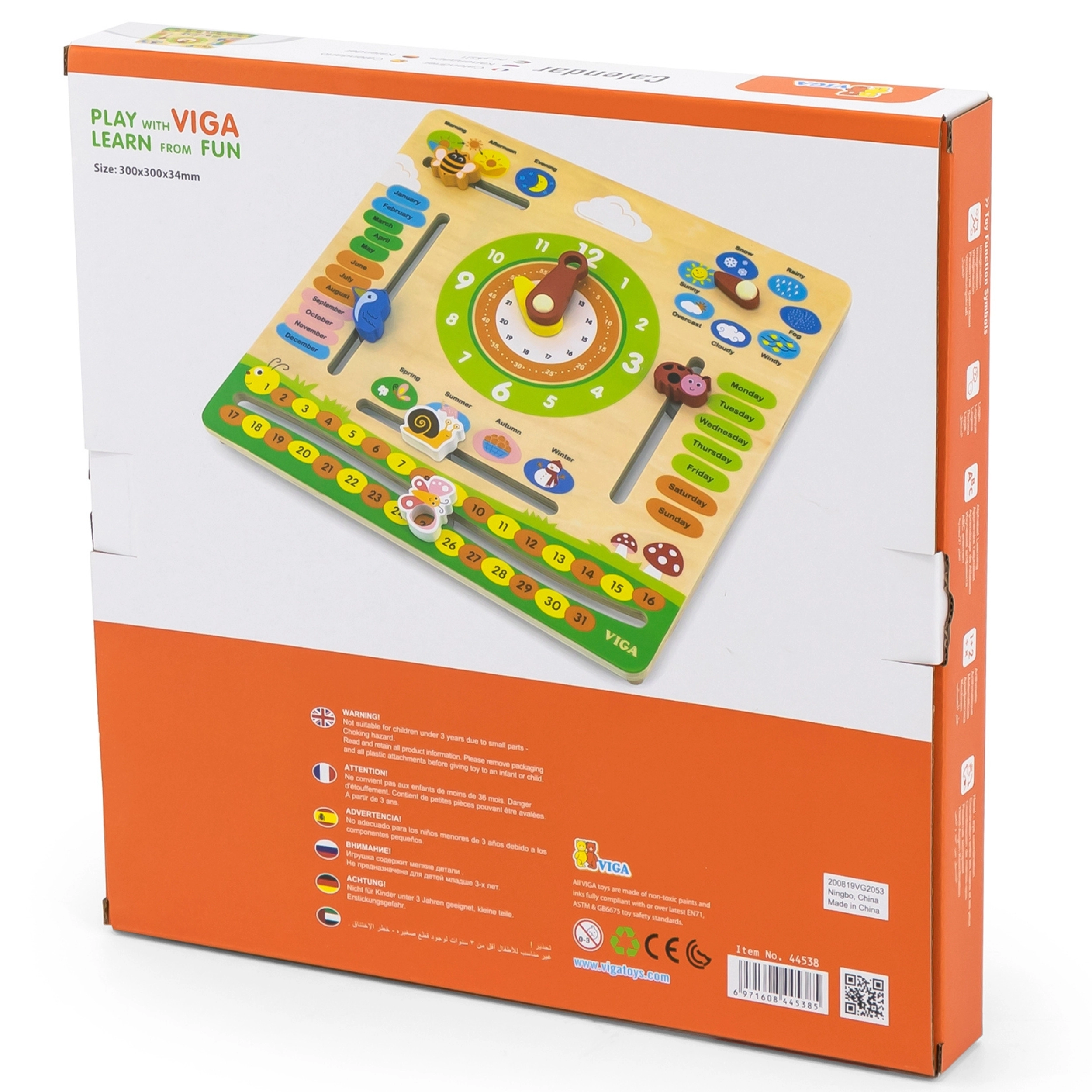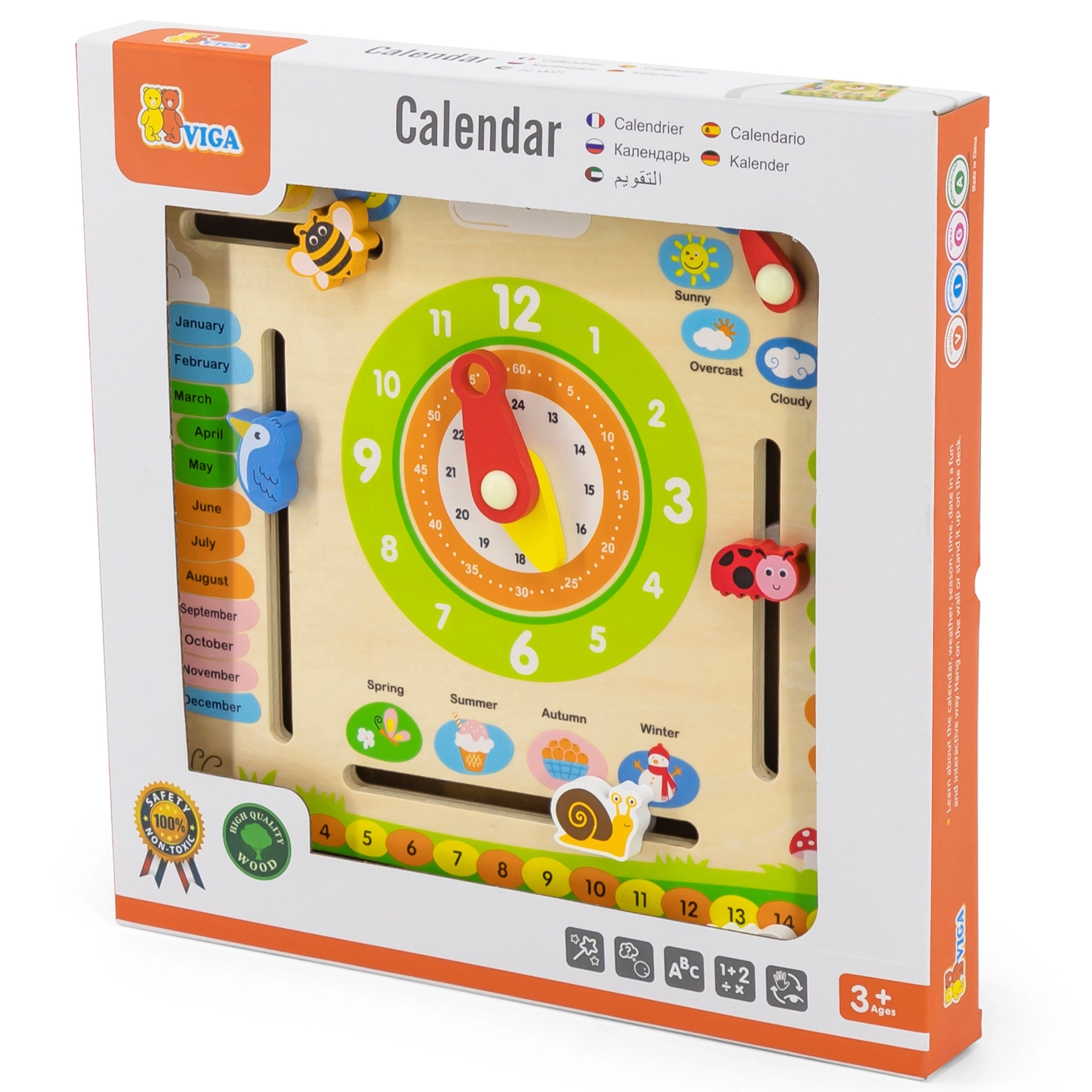 Deze interactieve houten kalender van het merk VIGA is ontworpen om kinderen te helpen hun kennis over data, tijd, weer en seizoenen uit te breiden. Het kan aan de muur worden gehangen of op een tafel worden geplaatst, waardoor het niet alleen functioneel is, maar ook een decoratief element in de kinderkamer. Dankzij de aansprekende kleuren en schattige illustraties is leren een plezier.