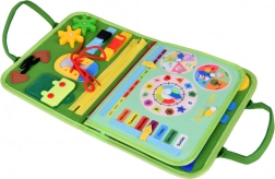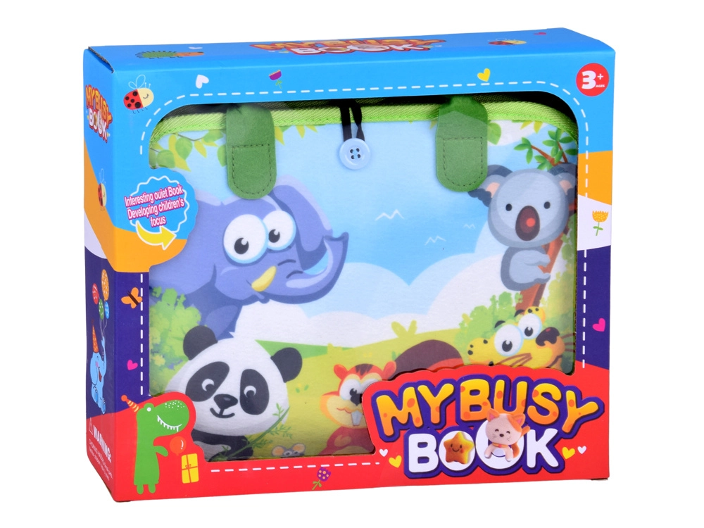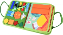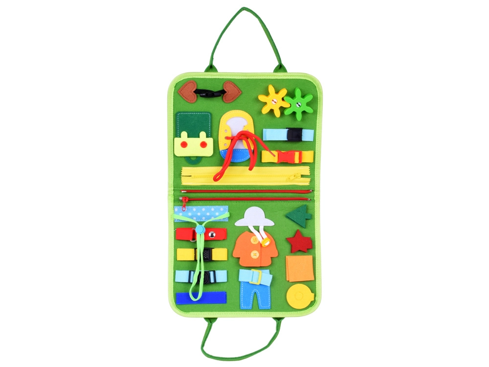 Dit creatieve boek ontwikkelt vaardigheden via betekenisvol spel. Binnenin vind je uitneembare zachte pagina’s met ritsen, gespen, knopen, veters, vormen met klittenband en educatieve elementen zoals een klok met draaibare wijzers, dagen van de week, weer en kalender. Kinderen oefenen hand-oogcoördinatie en logisch denken.