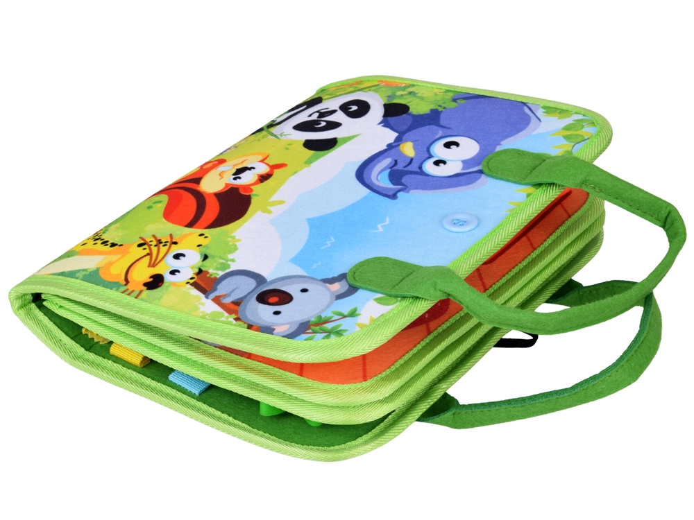 Draagbaar textiel manipulatieboek in de geest van Montessori met 6 interactieve pagina’s om spelenderwijs te leren: vastmaken en veterstrikken, vormen en voedsel sorteren, kalender, weer en leerrijke klok. Dankzij de zachte uitvoering, rits en handvat ideaal voor reizen. Ondersteunt fijne motoriek, zelfstandigheid bij aankleden en het leren van kleuren en vormen. Let op: het boek is in het Engels.