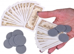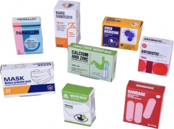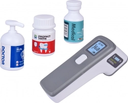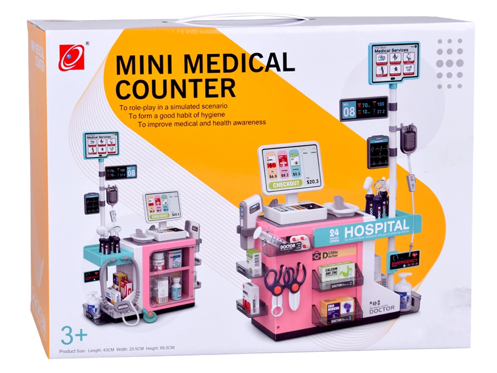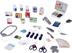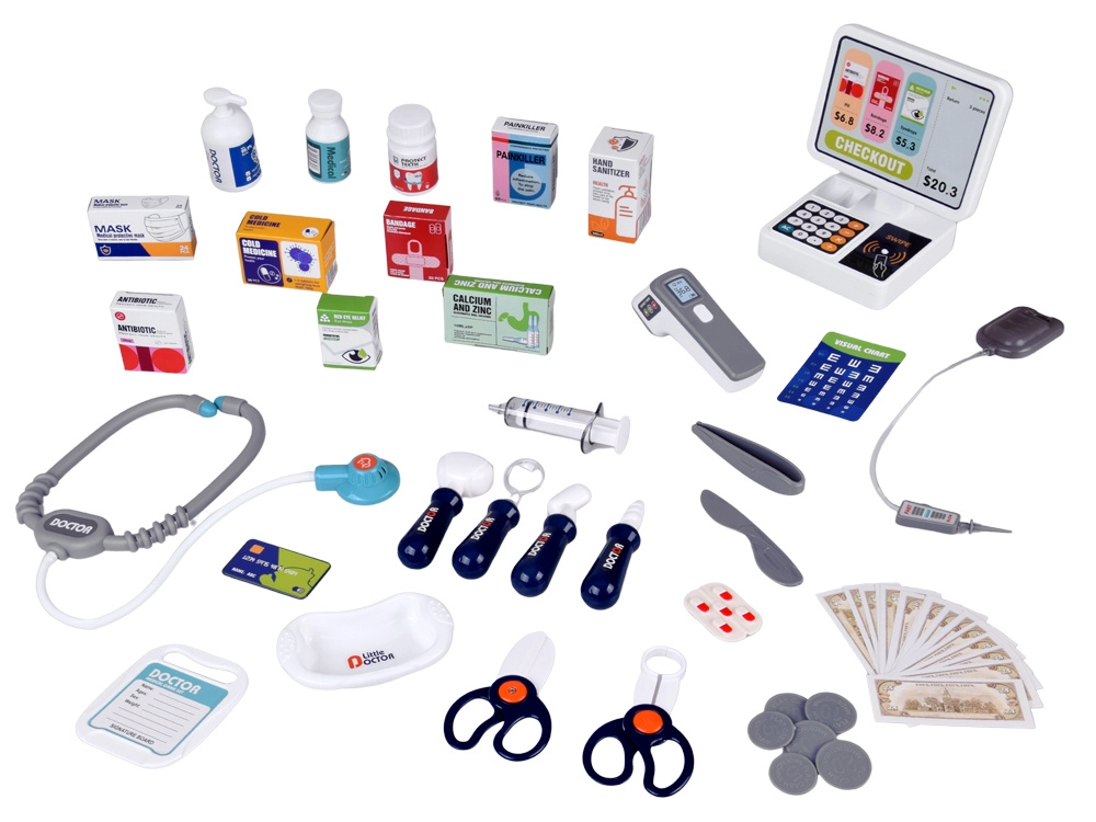 - Kassa met display en kaartlezer, betaalkaart, contant geld (munten en bankbiljetten), kastjes en planken, tabellen met parameters (pols, temperatuur), oogkaart, thermometer, stethoscoop met hartslaggeluid, infuus, bakje, veilige schaar, pincet, scalpel, otoscoop, reflexhamer, tandheelkundige spiegel, injectiespuit, blister “tabletten”, thematische “medicijn”-doosjes en -flesjes (decoratief, leeg)