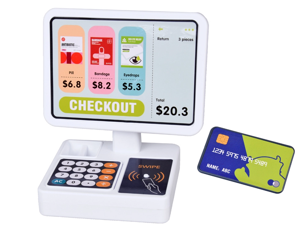 - Rollenspel kliniek/apotheek, kassa met terminal, geluidseffecten