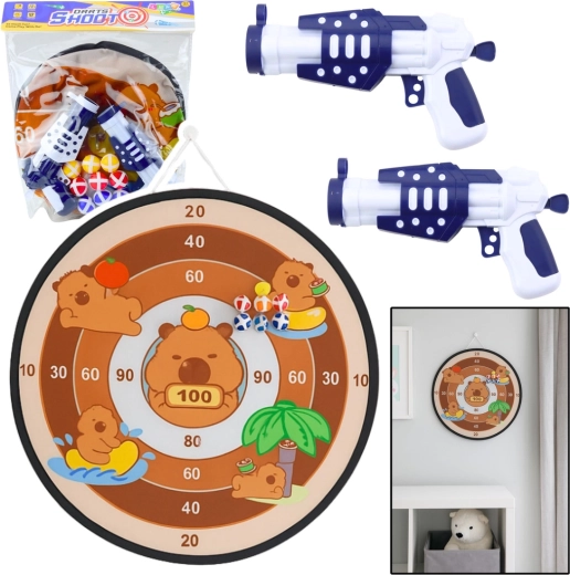 Het grote doel met aantrekkelijk capibara-design hang je eenvoudig aan de muur met de meegeleverde haak met zuignap. Twee pistooltjes in de set maken eerlijke één-tegen-één duels mogelijk – ideaal voor gezinnen en kinderbezoek. Het spel heeft geen batterijen nodig en is dus altijd klaar voor actie.