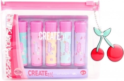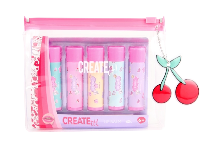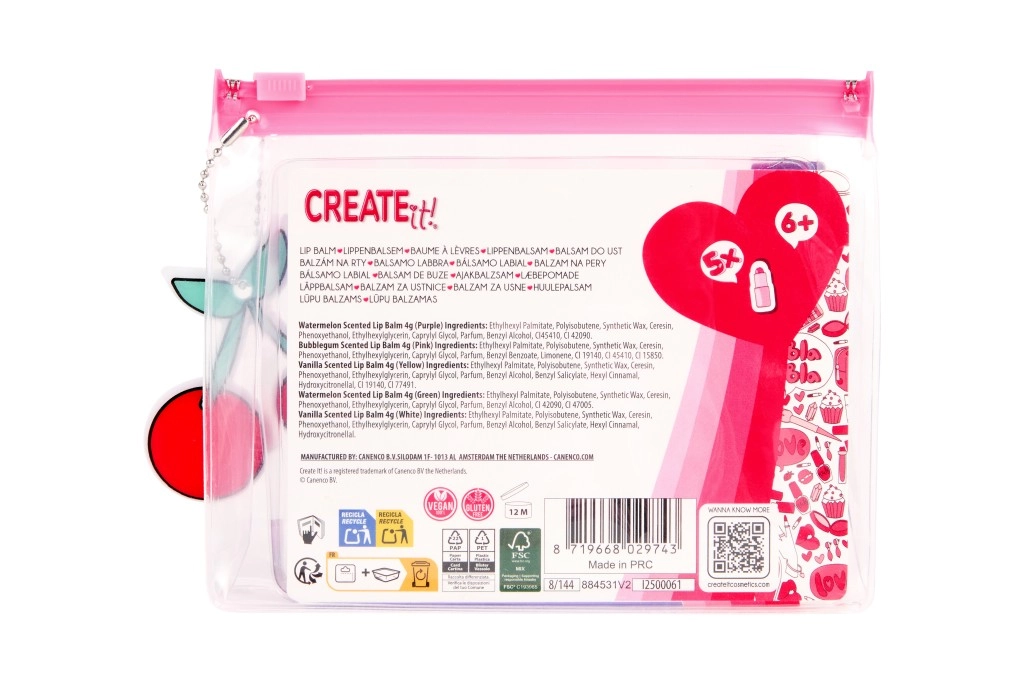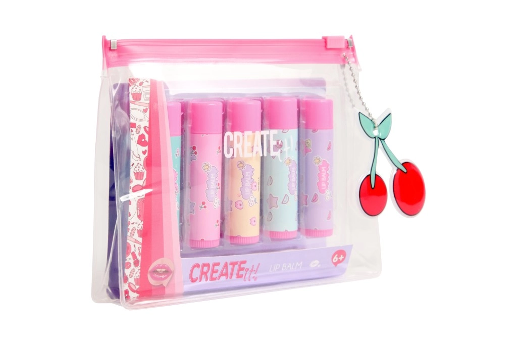 De CREATE IT!-set bevat vijf speelse lippenbalsems in pasteltinten die je lippen de hele dag verzorgen. Dankzij het praktische transparante etui met roze rits heb je alle balsems netjes bij elkaar – thuis, op school en onderweg.