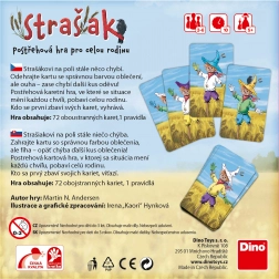 Zoek je een compact familiespel voor onderweg? Dino Strašák is een vlot kaartspel waarin kinderen de ontbrekende kleur van de kleding van de vogelverschrikker aanvullen (paars, geel, groen of blauw). Wie als eerste correct reageert, legt de bijbehorende kaart af. Degene die als eerste al zijn handkaarten kwijtraakt, wint.