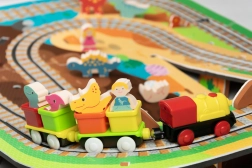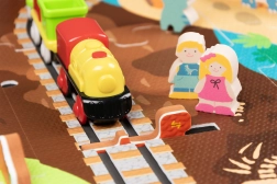 Inbegrepen zijn 12 raildelen, 42 thematische accessoires en praktische bakjes voor in de wagonnetjes om passagiers of kleine spulletjes te vervoeren. Het zachte, duurzame en geurloze EVA-materiaal zorgt voor comfortabel en veilig spelen. Het product voldoet aan EN 71, RoHS 2011/65/EU en heeft een CE-markering.