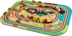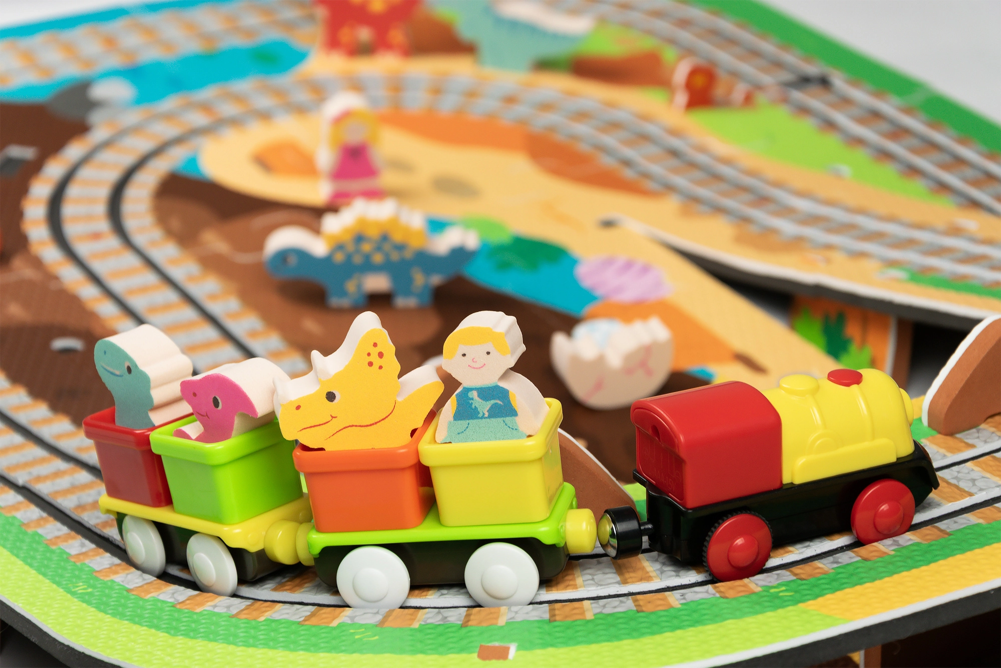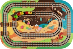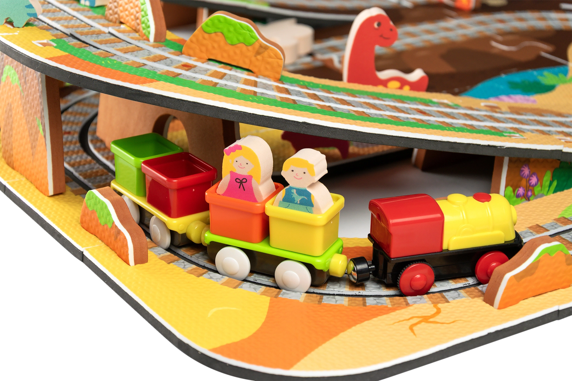 Deze creatieve set combineert EVA-schuimpuzzels met dinothema en een spoorbaan voor het treintje. De onderdelen klikken eenvoudig in elkaar en maken het mogelijk vlakke trajecten en steile hellingen te bouwen. De locomotief met wagonnetjes (op batterijen) beweegt soepel over het spoor en kinderen kunnen het spel verrijken met houten/schuimfiguren van dinosaurussen, rotsen en tunnels.
