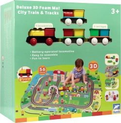 Deze creatieve set combineert een zachte vloermat met een 3D-stad en een spoorbaan. Kinderen bouwen een kleurrijk decor met straatjes, gebouwen, luchthaven, boerderij, zee, camping en bergen, en laten de batterijlokomotief soepel rijden over de samengestelde baan. Dikke EVA-schuimdelen dempen schokken, isoleren tegen kou en creëren een veilige speelplek.