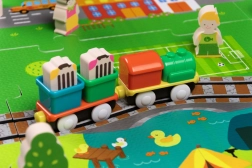 Er zijn 34 accessoires inbegrepen – figuurtjes, borden, bomen en andere decoraties voor realistisch spel. De trein met wagonnetjes kan eenvoudig worden gekoppeld, lading in doosjes worden vervoerd en de scène naar eigen fantasie worden aangepast. De set is ideaal als cadeau, voldoet aan EN 71, RoHS 2011/65/EU en heeft CE.