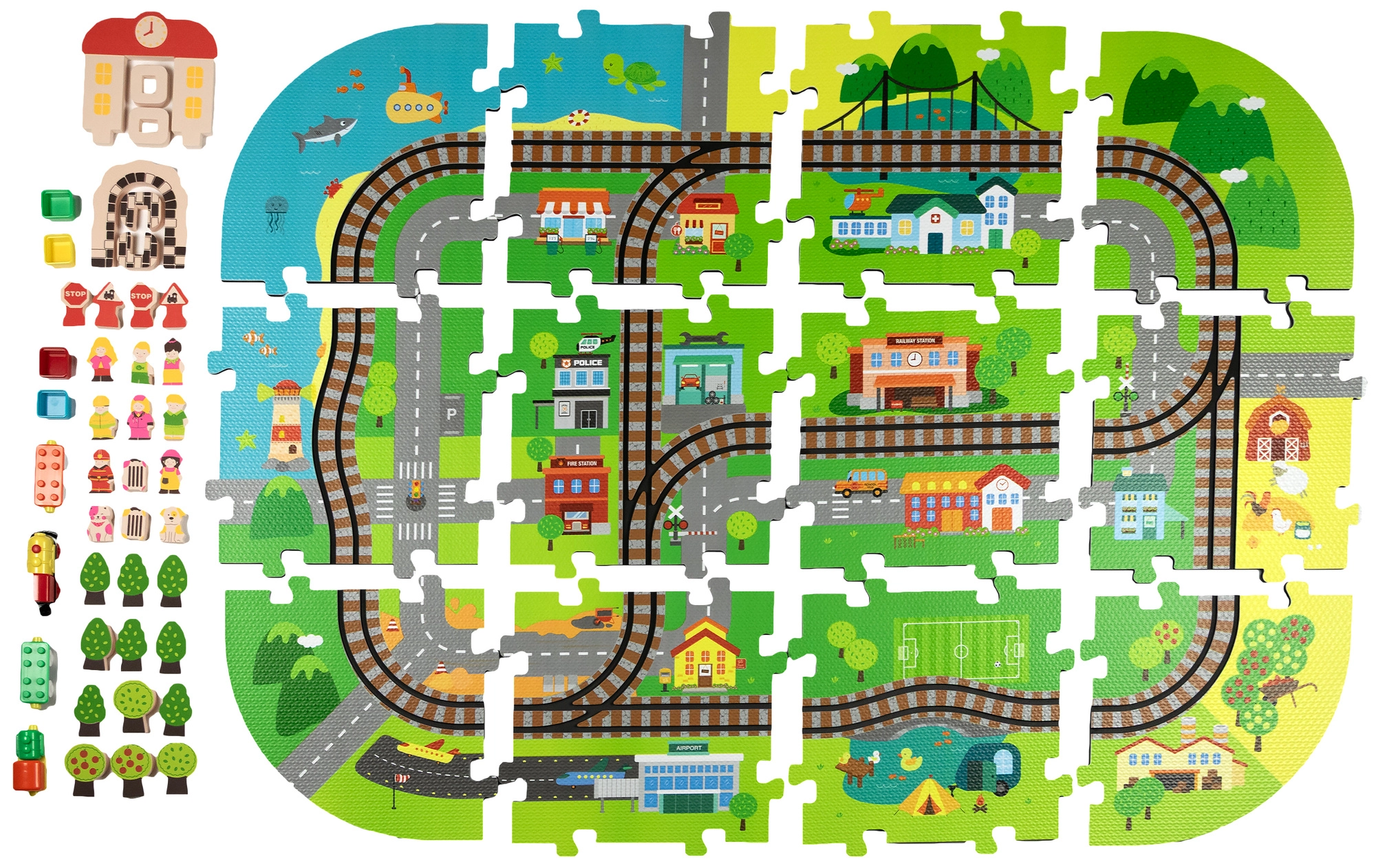 Verbind de stukken als een puzzel en maak je eigen stad met straten, spoorbanen, gebouwen en natuur. Dikke EVA-delen behouden hun vorm en zijn gemakkelijk schoon te maken.