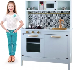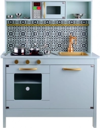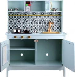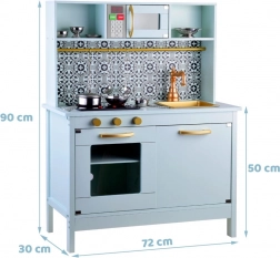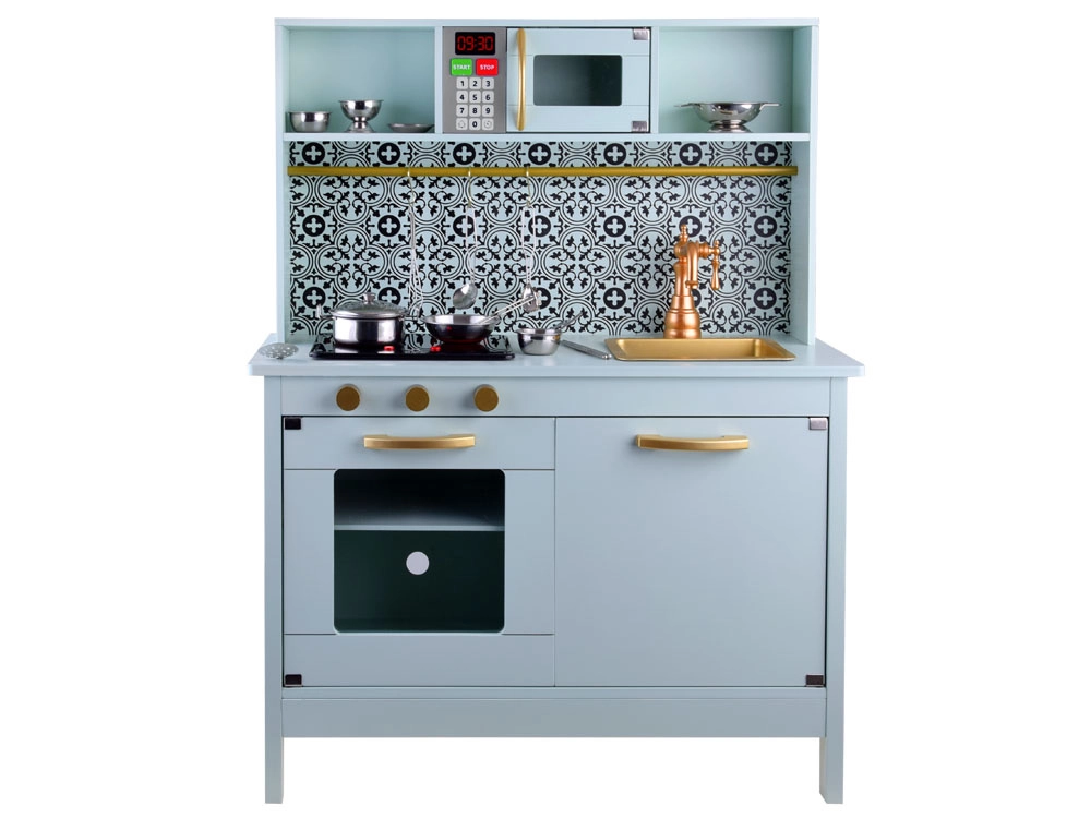 Deze elegante mintgroene kinderkeuken met zwart-witte mozaïek valt op door de hoogwaardige afwerking van hout en MDF. Realistische elementen zoals een inductiekookplaat met licht en geluid, een magnetron en een oven met transparante deur nemen kinderen mee in de wereld van fantasie en rollenspel.