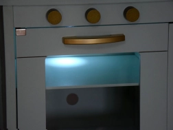 Inclusief een gouden gootsteen met vintage kraan, gouden knoppen en grepen en een praktische stang voor het ophangen van gerei. De uitgebreide set roestvrijstalen accessoires (pan met deksel, steelpan, vergiet, kommen, bordjes, bestek en gereedschap) laat kinderen serveren en “koken” als in een echte keuken.