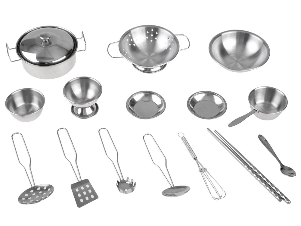 In de verpakking vind je een vergiet, pan met deksel, steelpan, kommen, bordjes, bestek en keukengerei – allemaal van duurzaam roestvrij staal.
