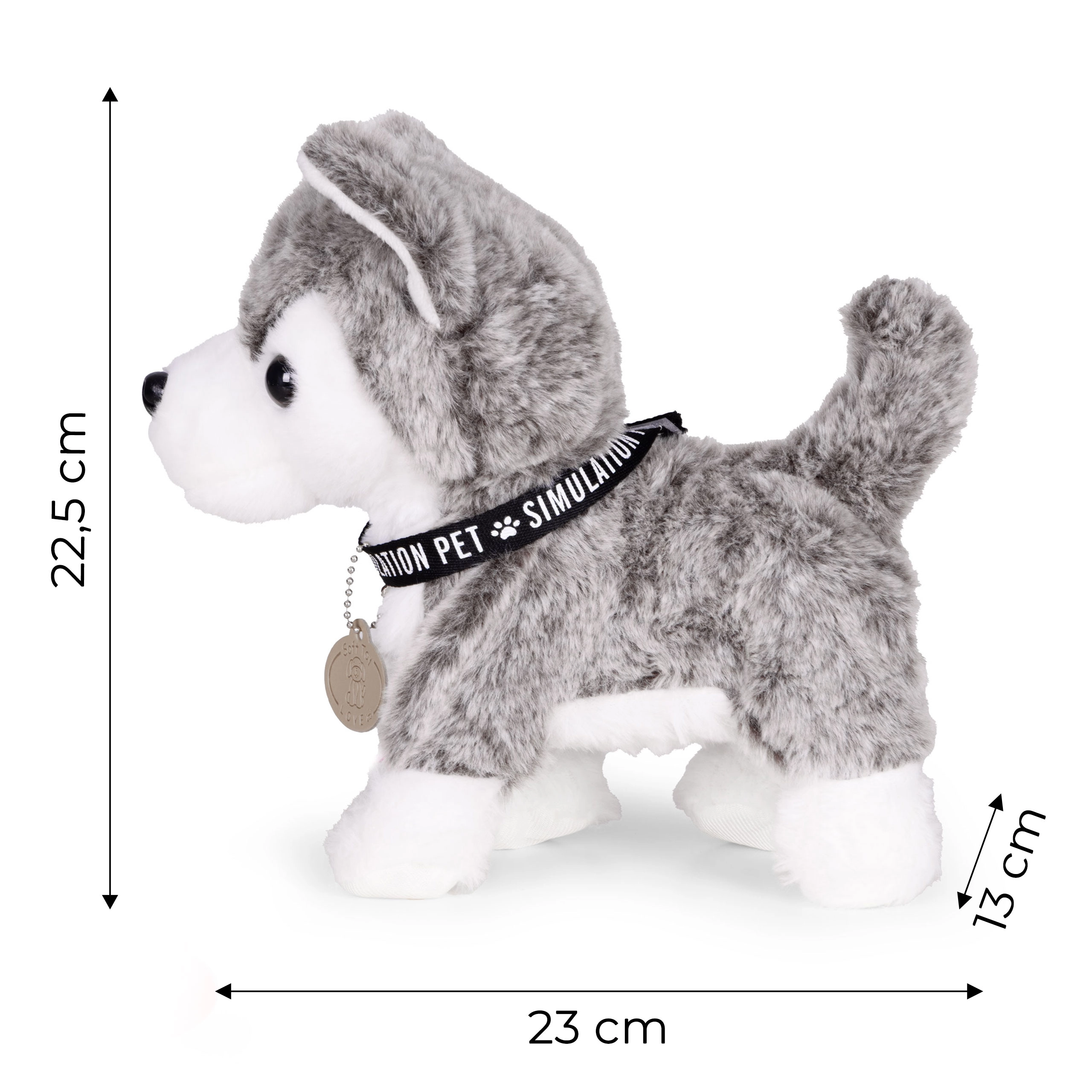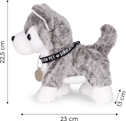 Wanneer je op de knop op de lijn drukt, begint de husky te lopen, kwispelt vriendelijk met zijn staart en knikt met zijn hoofd – net als een echt puppy.