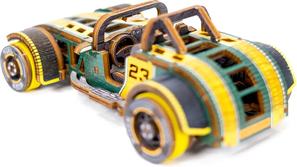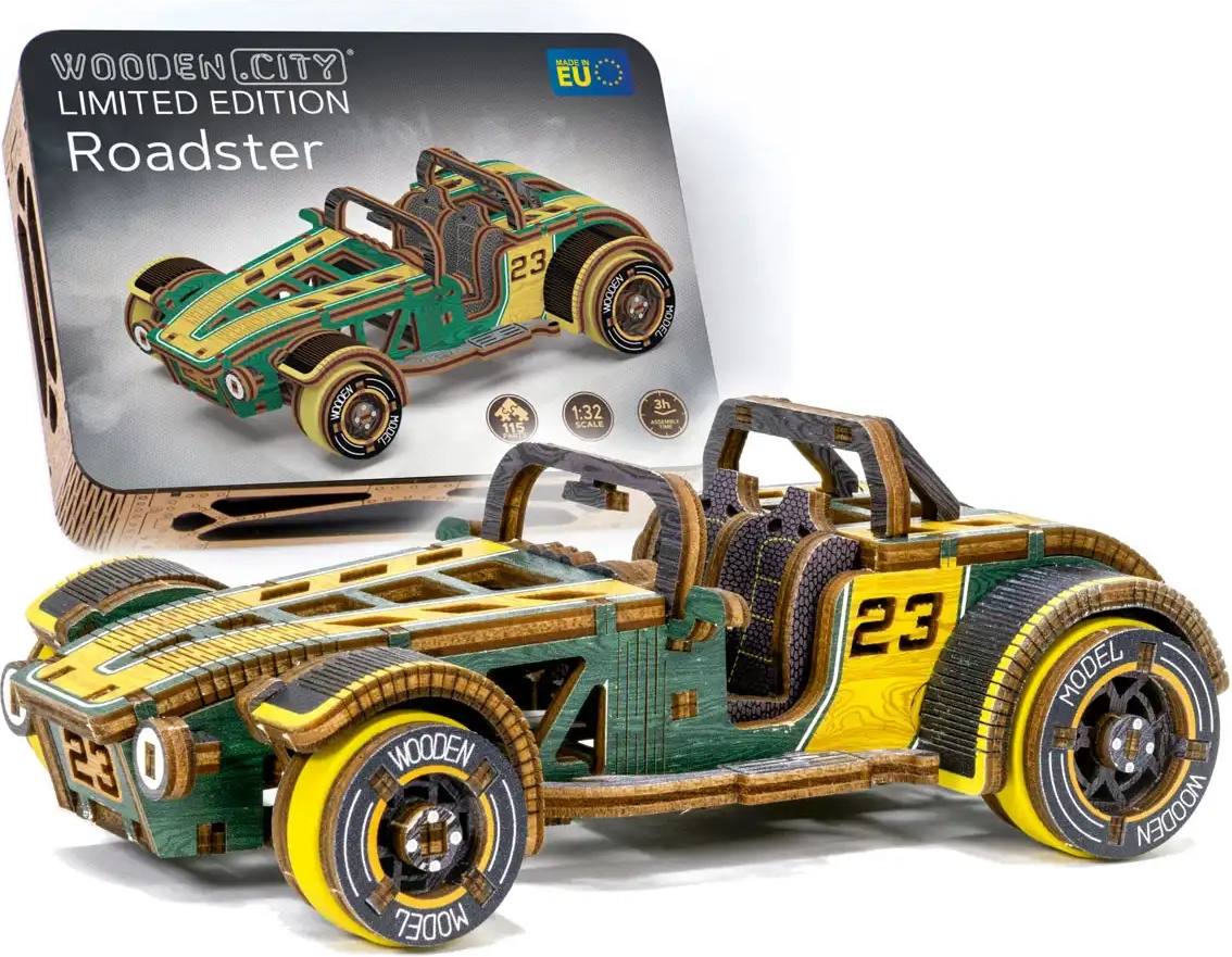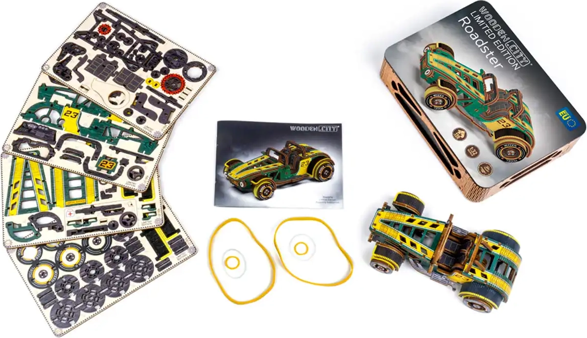 De Houten 3D-puzzel Roadster – limited edition brengt het plezier van bouwen én de voldoening van een afgewerkt mechanisch model. Dankzij nauwkeurig laser­gesneden onderdelen van ecologisch berkenmultiplex zet u zonder lijm een verfijnde wagen in elkaar met realistische details en een soepele werking.