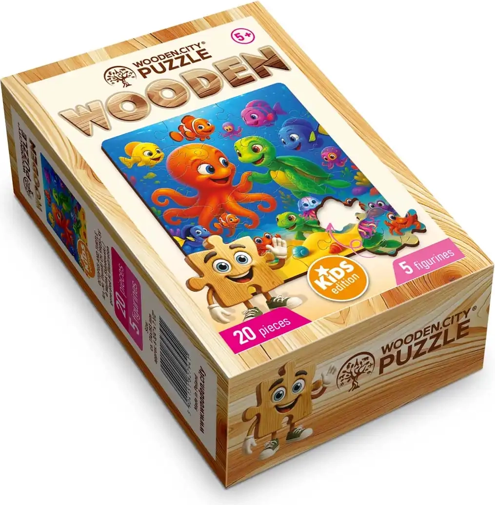 De houten puzzel WOODEN CITY met een octopus en een schildpad neemt kinderen mee naar een fascinerende onderwaterwereld. Elk stukje is met de grootste precisie gemaakt zodat het perfect past en resulteert in een betoverende scène van circa 19,3 × 17,4 cm.