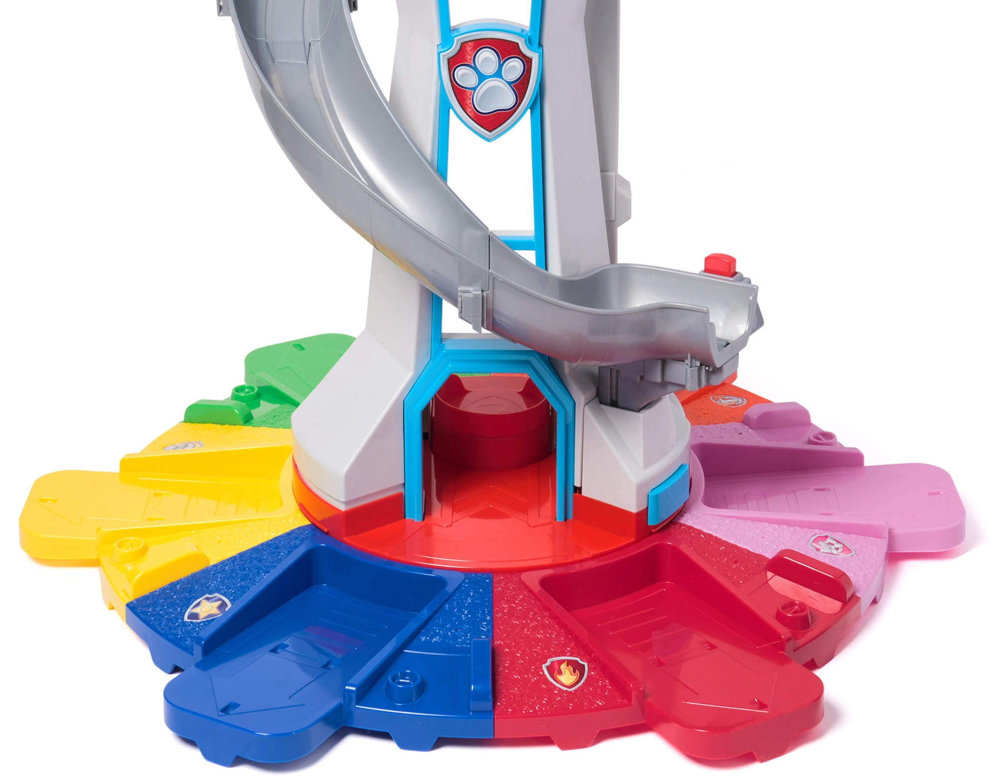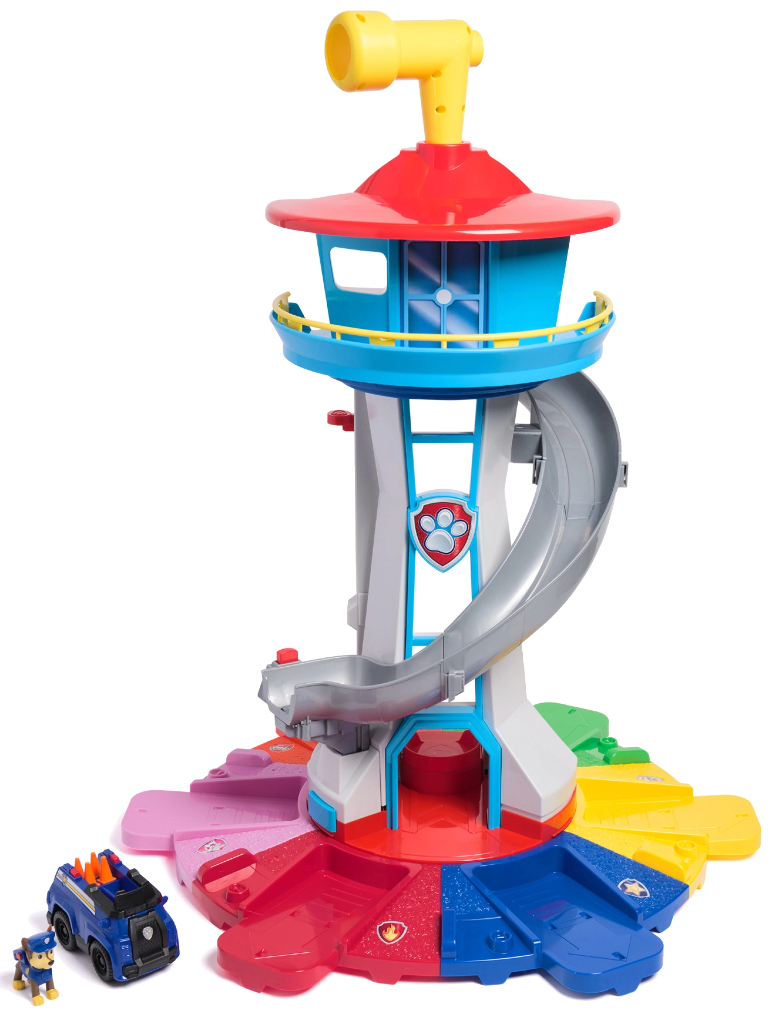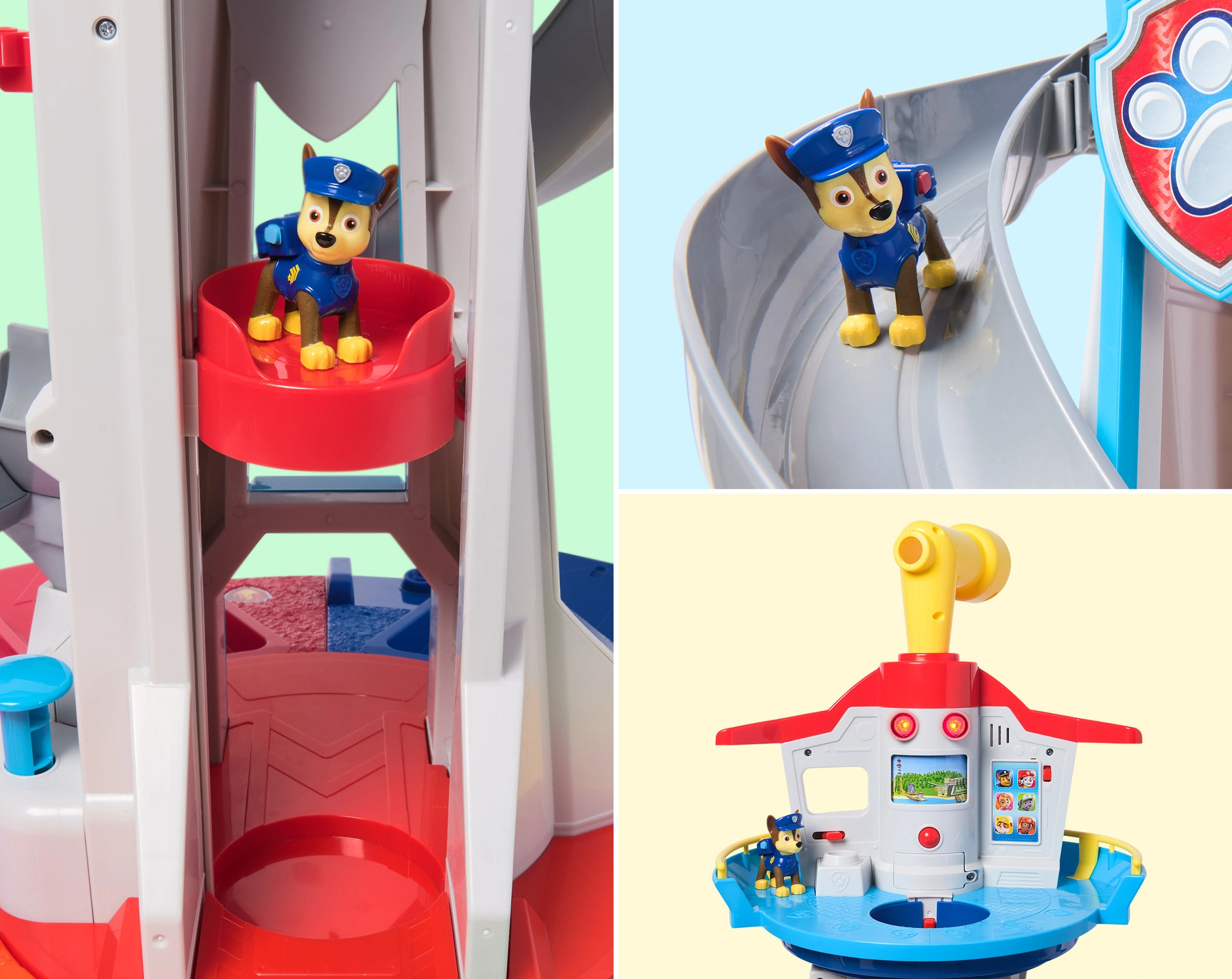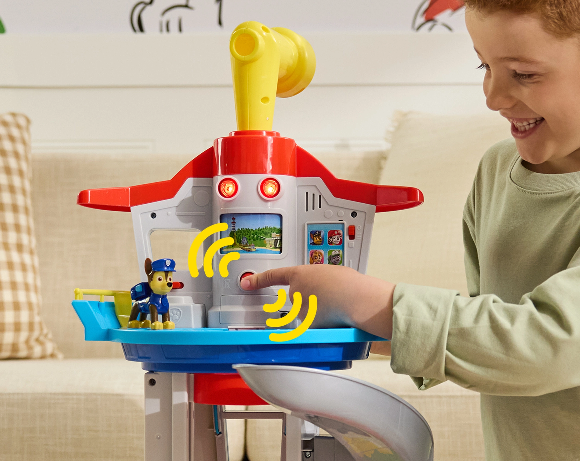 De iconische basis uit PAW PATROL biedt kinderen eindeloze speelmogelijkheden. Kies een missie via het paneel met knoppen en effecten, breng Chase met de lift naar boven, kijk rond met de draaibare periscoop en start de heldhaftige reddingsactie via de brede glijbaan rechtstreeks naar de draaibare lanceerramp.