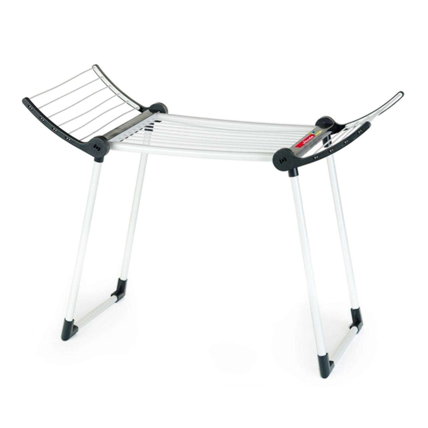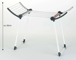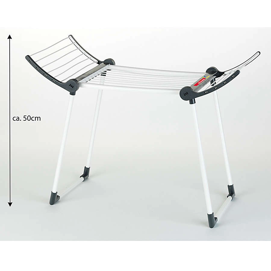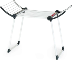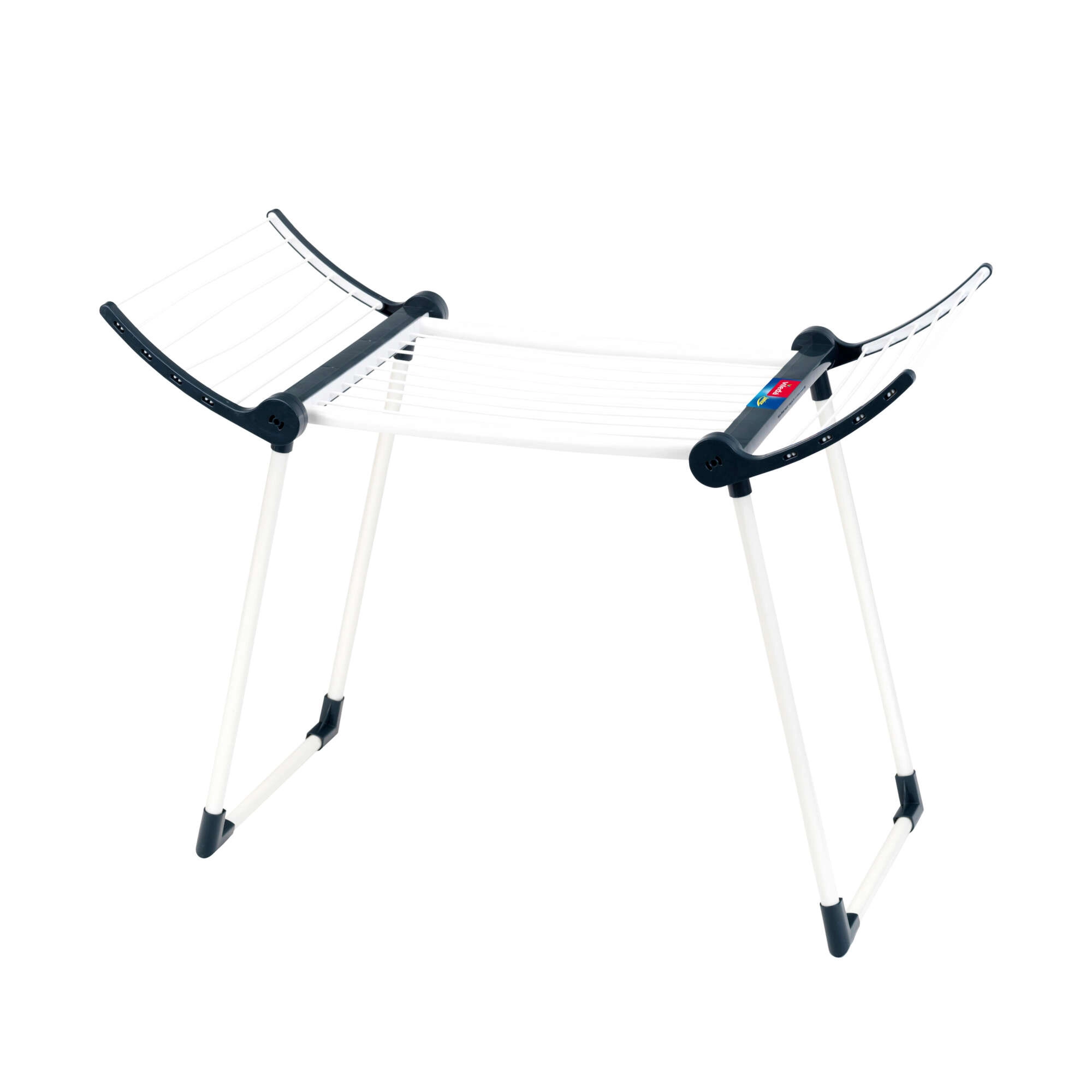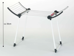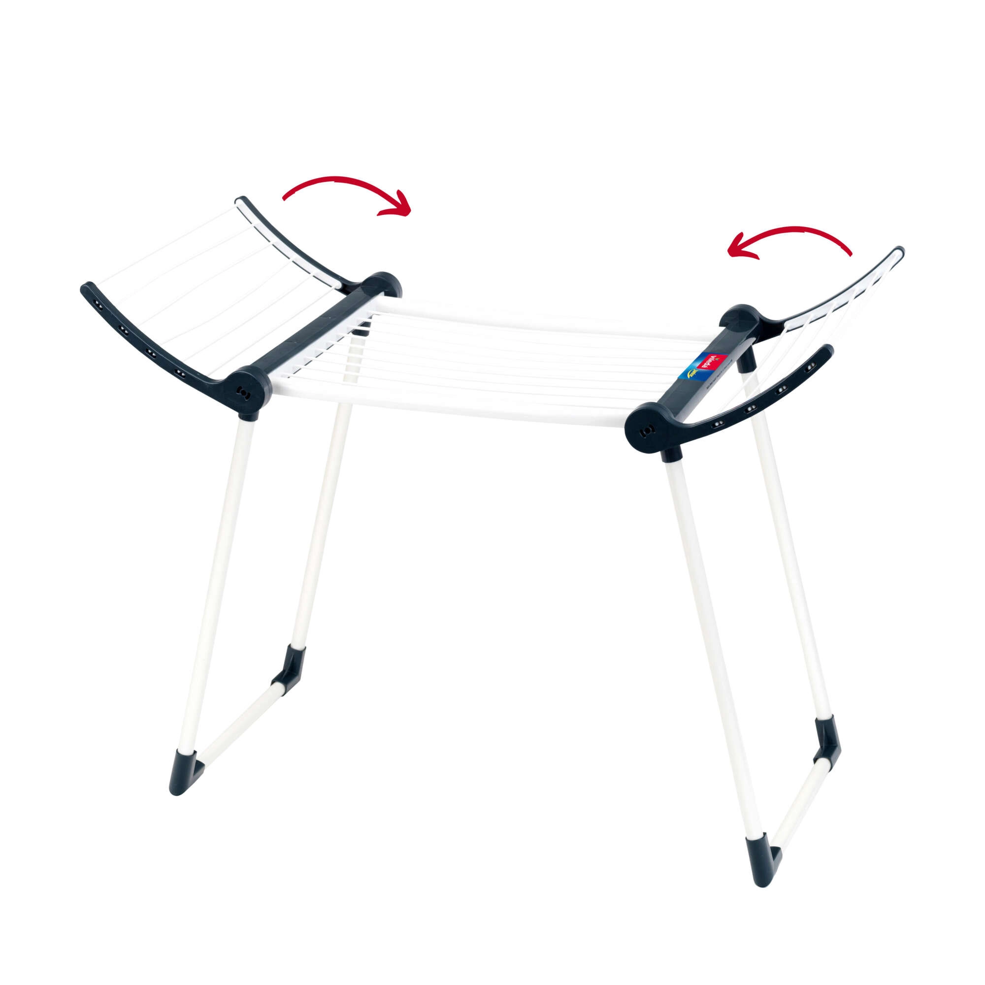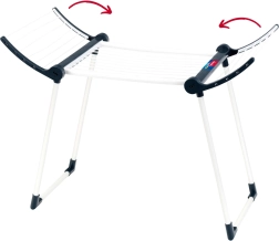 De constructie is stevig en stabiel dankzij de dubbele poten. Het droogrek is wit met zwarte accenten en heeft twee neerklapbare zijkanten voor extra droogruimte. Na het spelen vouw je het eenvoudig compact op, waardoor het ruimte bespaart in de kinderkamer.